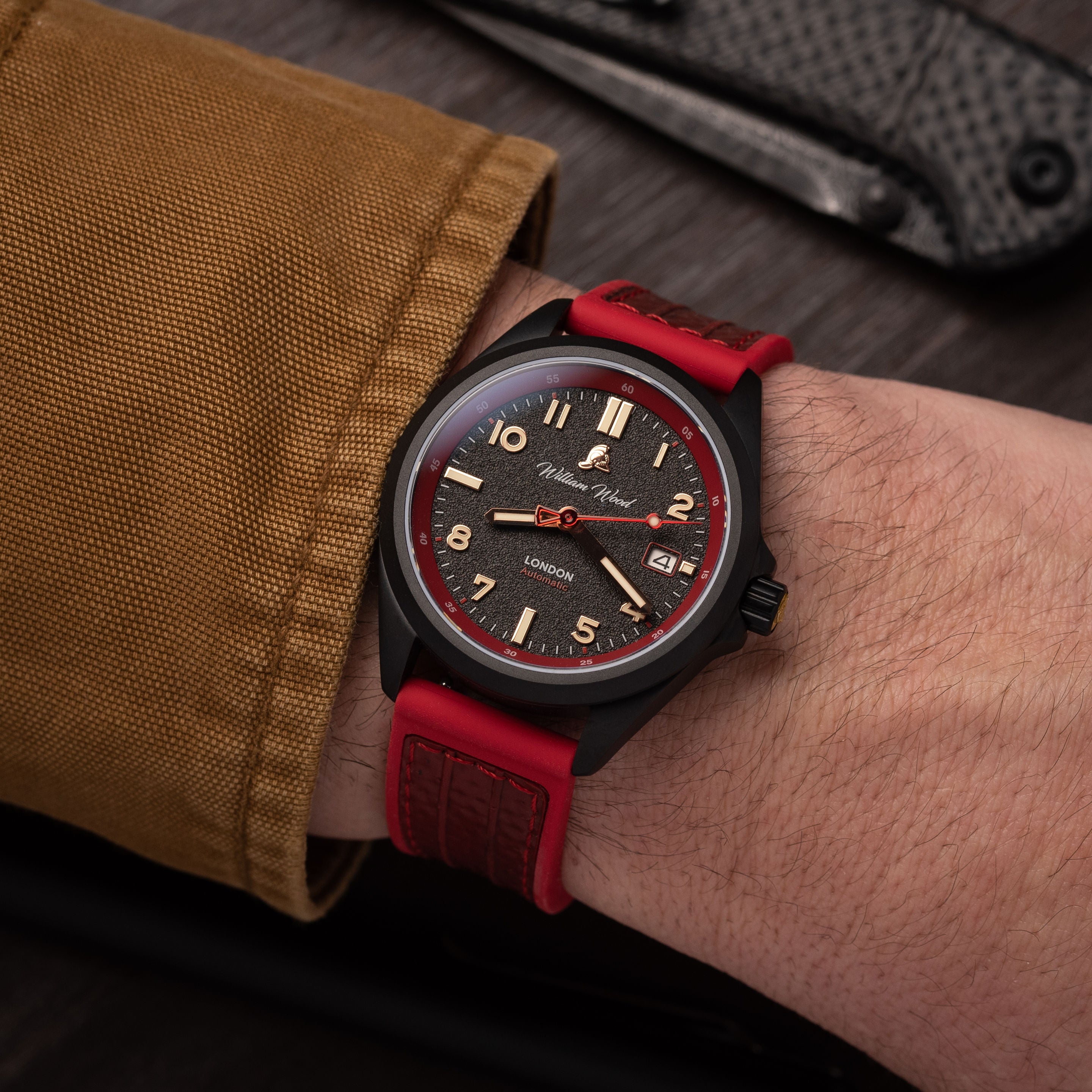 A core value of William Wood Watches seen in all of our collections is upcycling from firefighting materials. Our Fearless Collection has a 100 year old British brass firefighter's helmet melted down and placed inside the crown of the watch. The Fearless Watch also features straps made from repurposed black fire hose, a rare Fire Service colour.