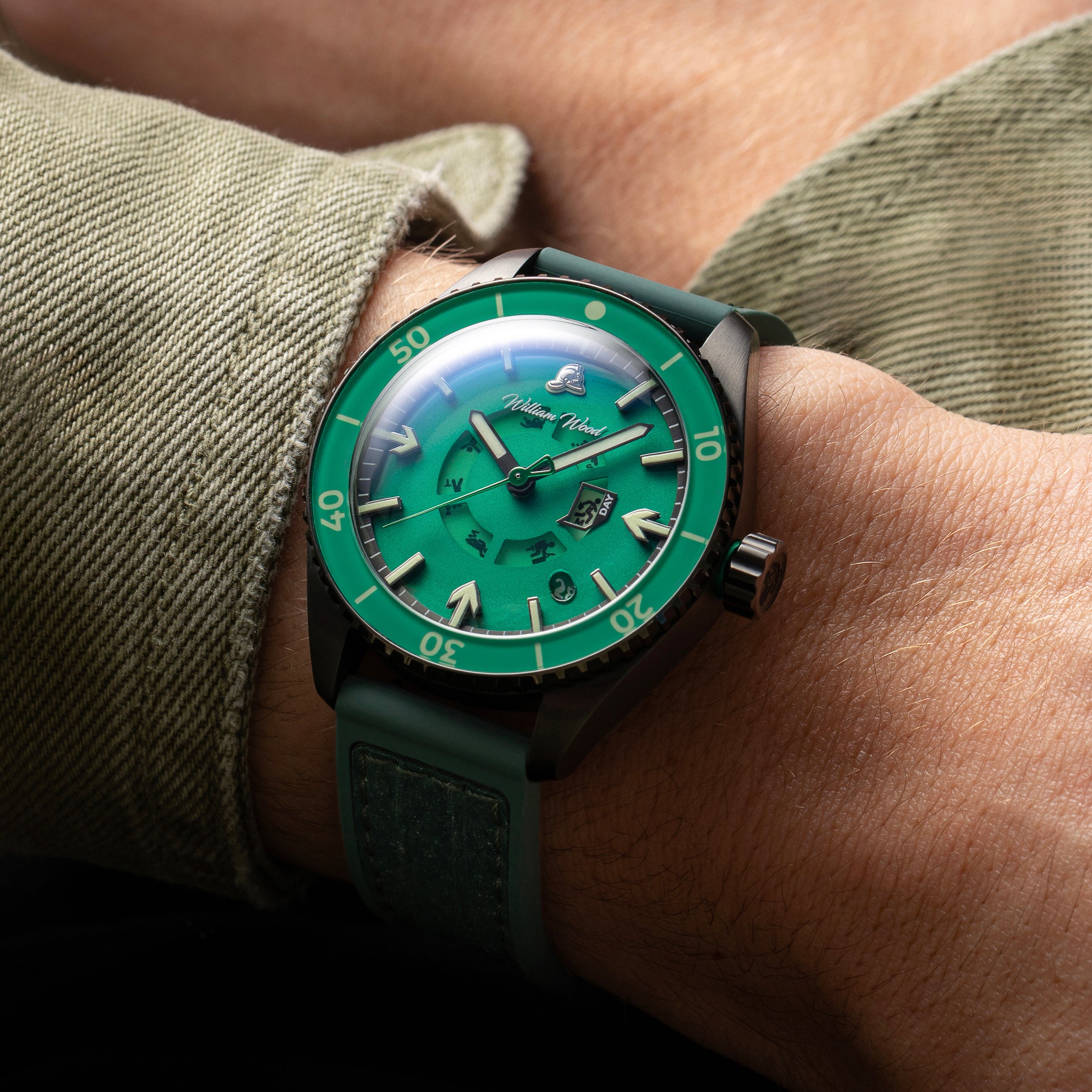 Our Fire Exit Watch has instant visual impact. When you wear this timepiece you know straightaway that it is a William Wood Watches creation. The fire exit green Pantone colour used on our dial and bezel makes for a stunning contrast against our brushed gun metal grey case. Then you have the added addition of our British Racing Green fire hose straps.