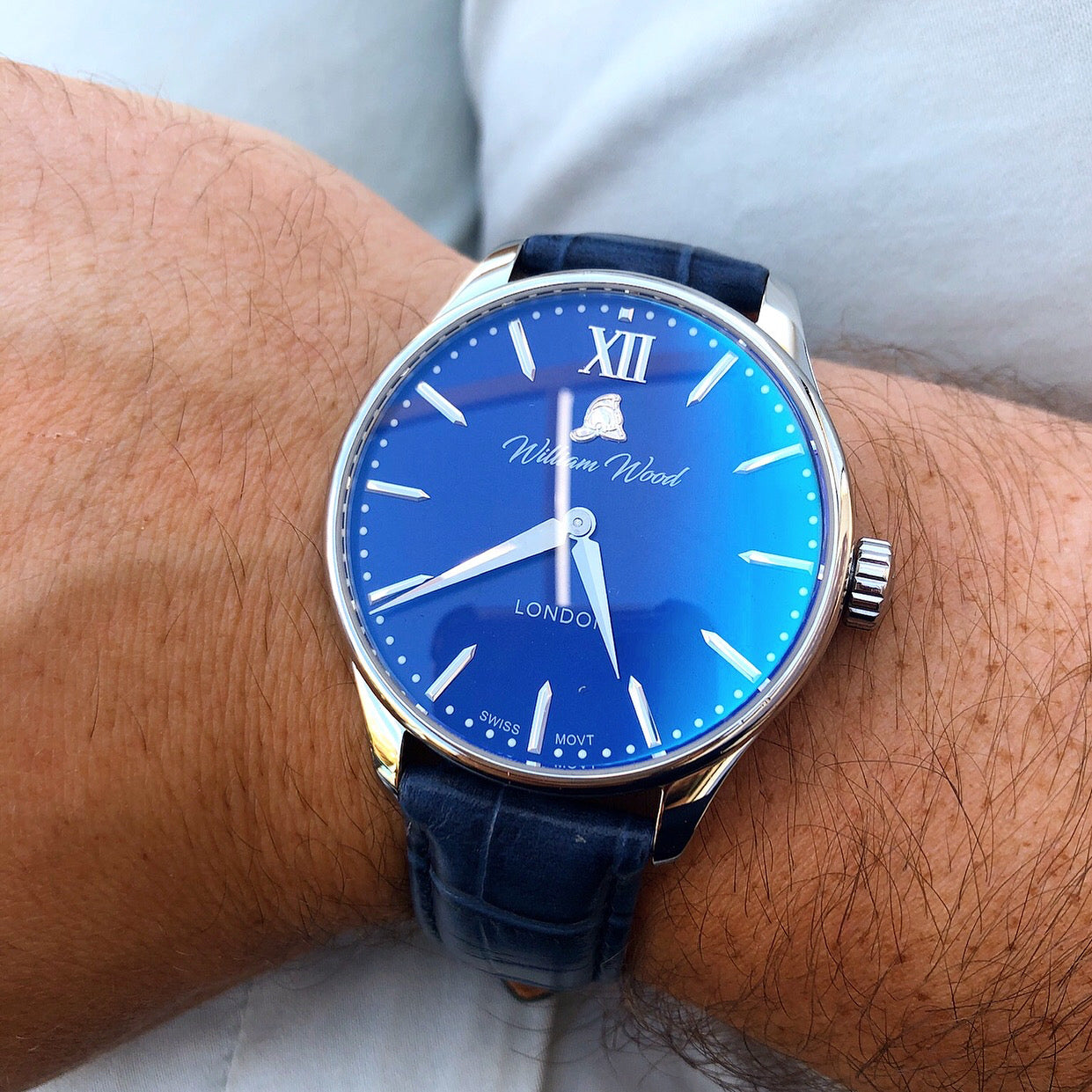 William Wood Watches logo takes inspiration from the side profile of an original British brass firefighter's helmet. Our brass firefighter's helmet logo sits proudly on our Chivalrous dress watch dial.