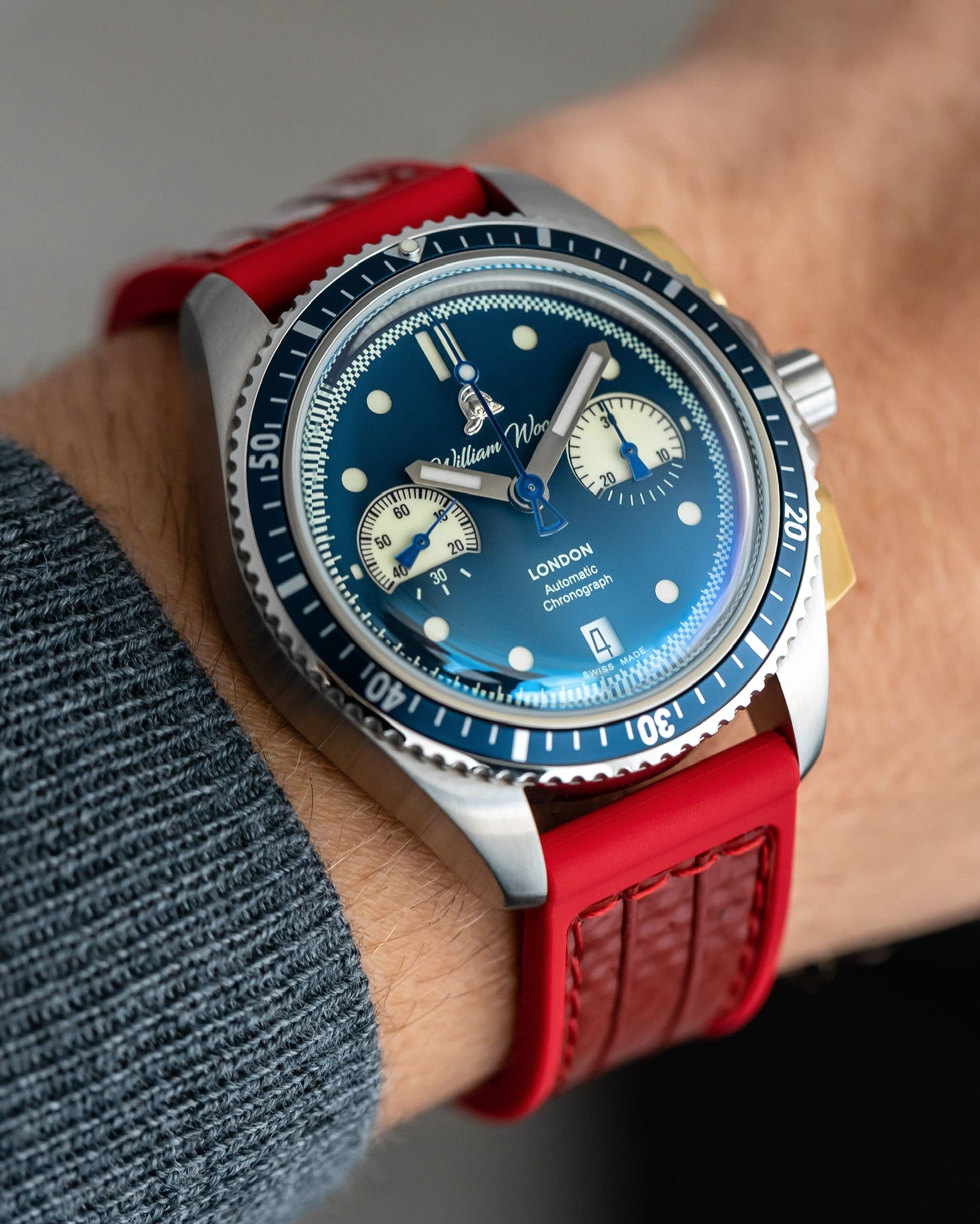 Our Triumph Collection sub dials take inspiration from the dashboard gauges within a fire engine cockpit. Reminiscent of pressure pumps, the sub hands are finished in red, blue or gold to match the main chronograph hand, shaped in the style of a vintage fire bell chime. The chronograph hand and 30 minute sub dial is operated by the antique brass finish buttons located on the side of the case.
