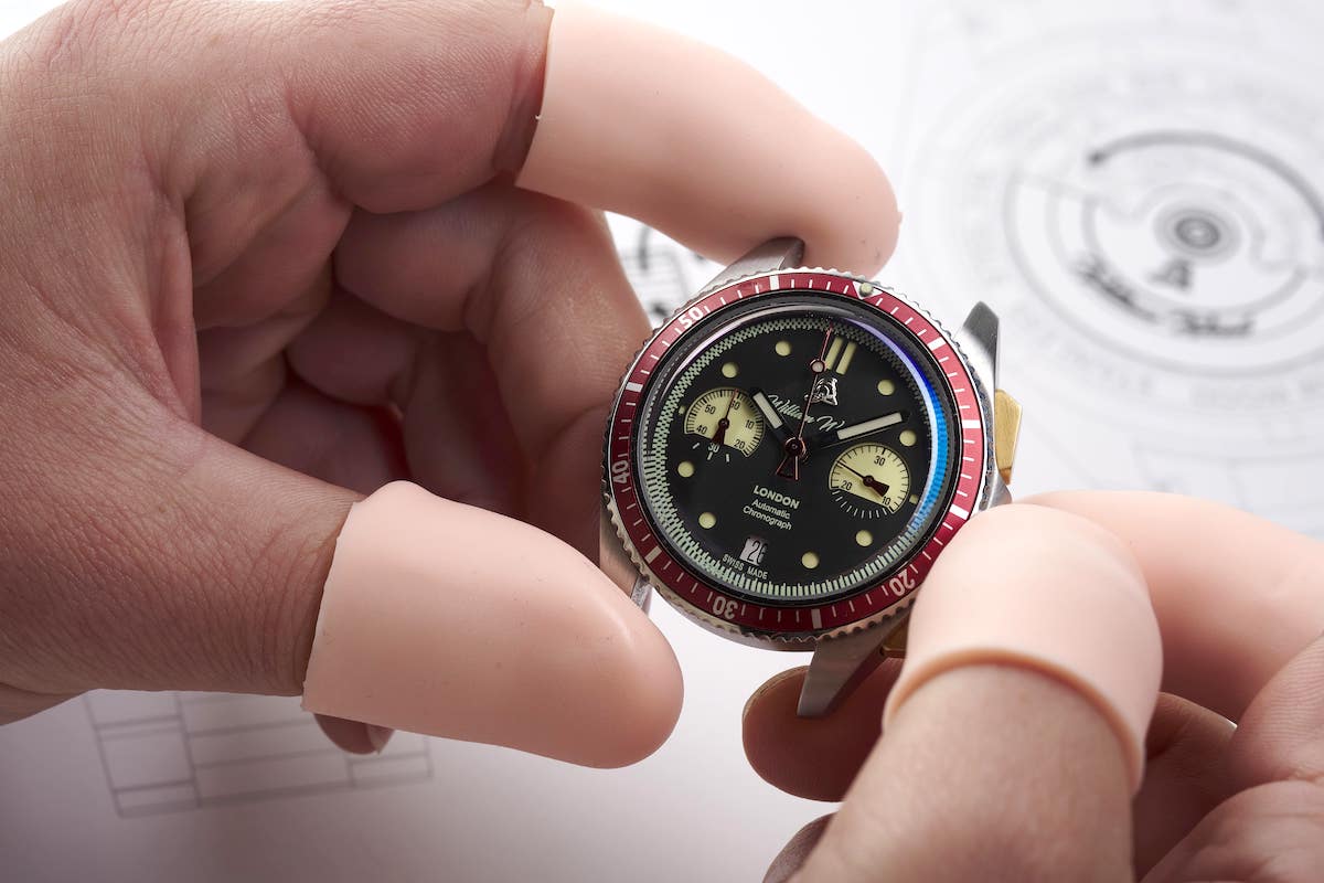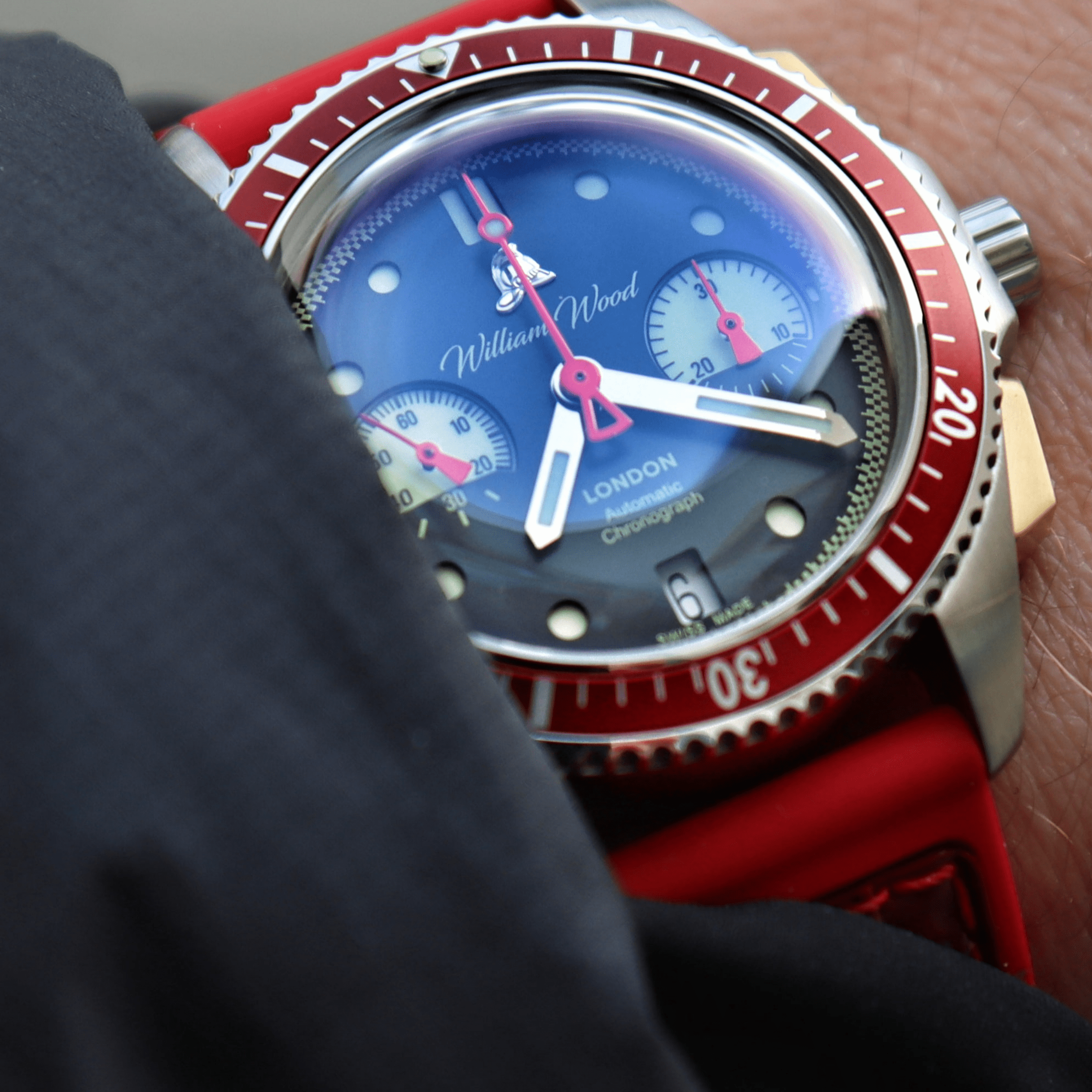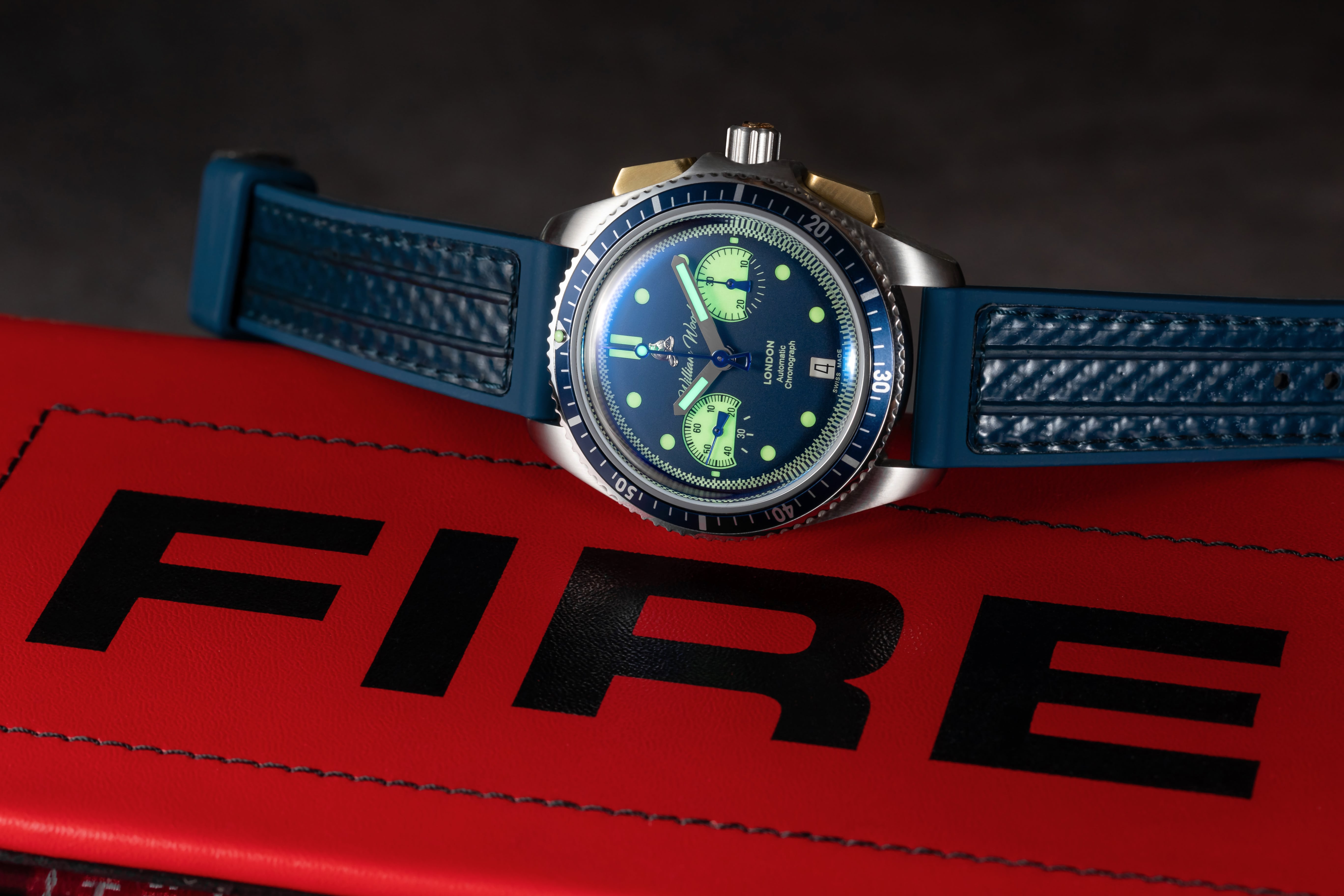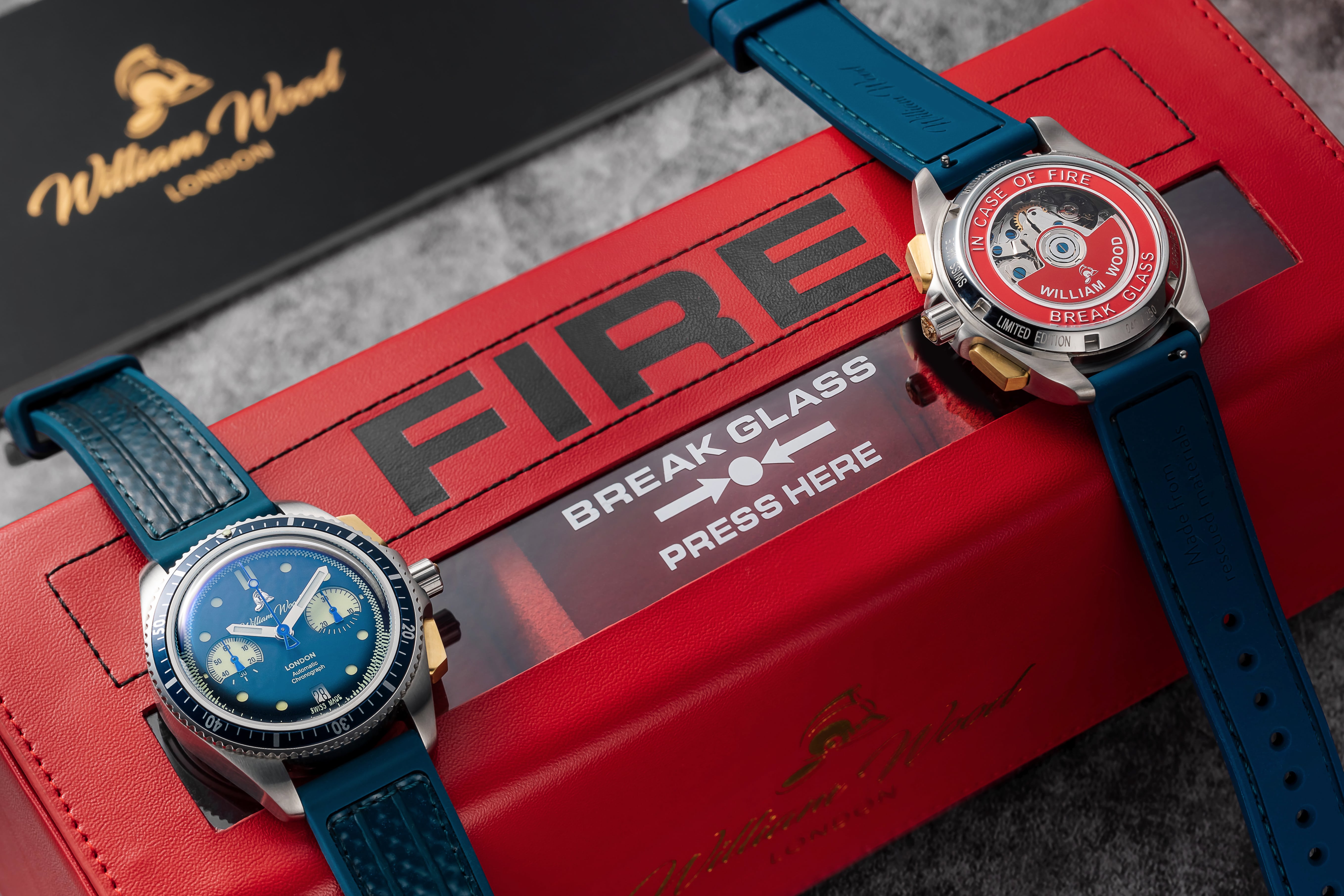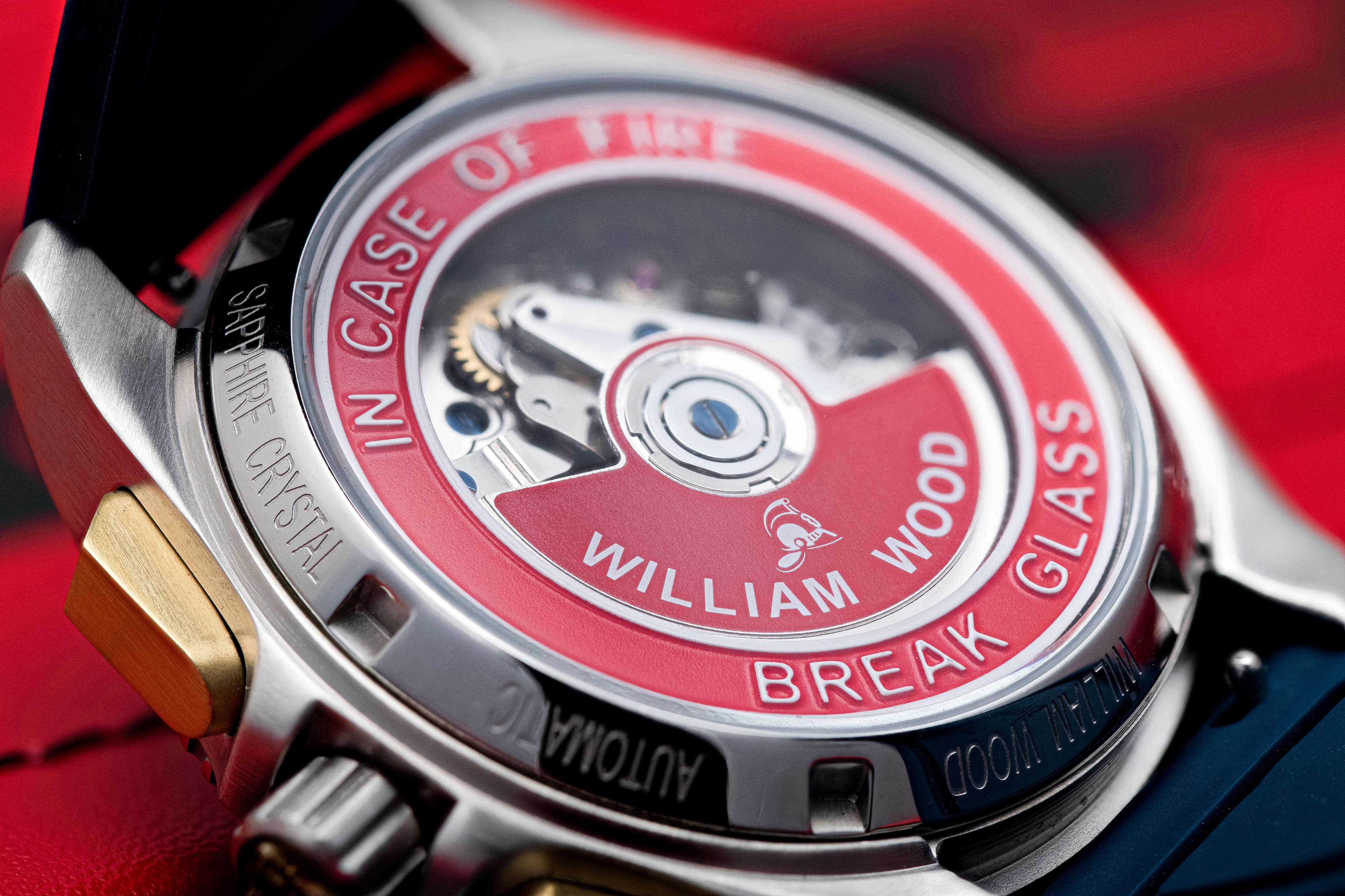 We have created a one of kind custom-made fire alarm case back. With our Sellita SW510 movement residing inside as the fire alarm, and a glass partition between the emergency plate 'In case of fire break glass'. This really is one of our proudest inventions yet and an iconic statement aligned to the heritage of William Wood Watches.