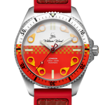 The dial has a matte coloured red and white finish with applied indices inspired by the locking wheel nuts from an Australian fire engine. Running through the centre of the dial and bezel are the UV yellow checkered markings from the side of an Australian fire engine. The dial and hands are curved creating a subtle optical illusion when looking through the side of the double domed sapphire crystal glass. Sat below the dial is a C3 grade Super-LumiNova disc finished in the colour green.
