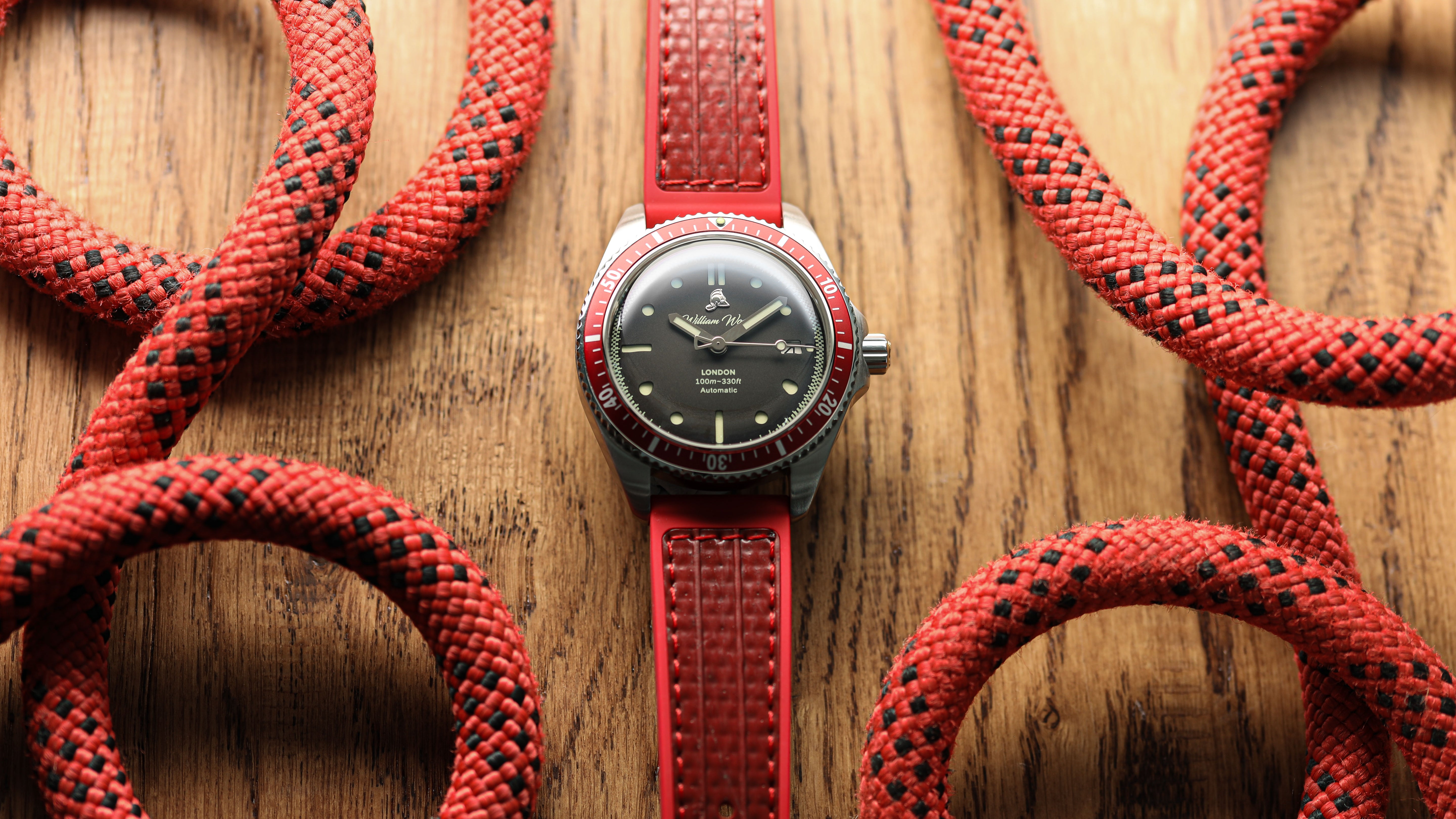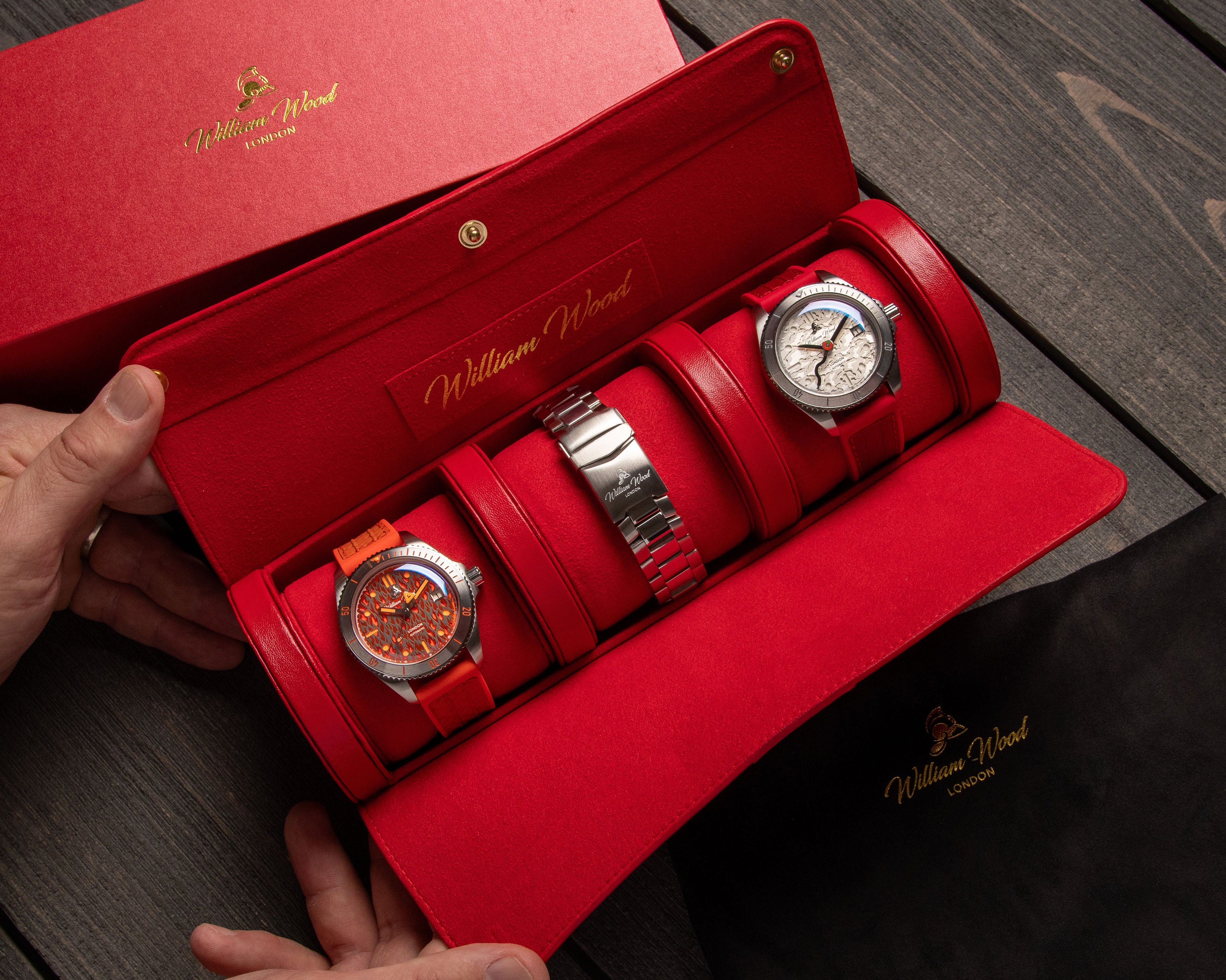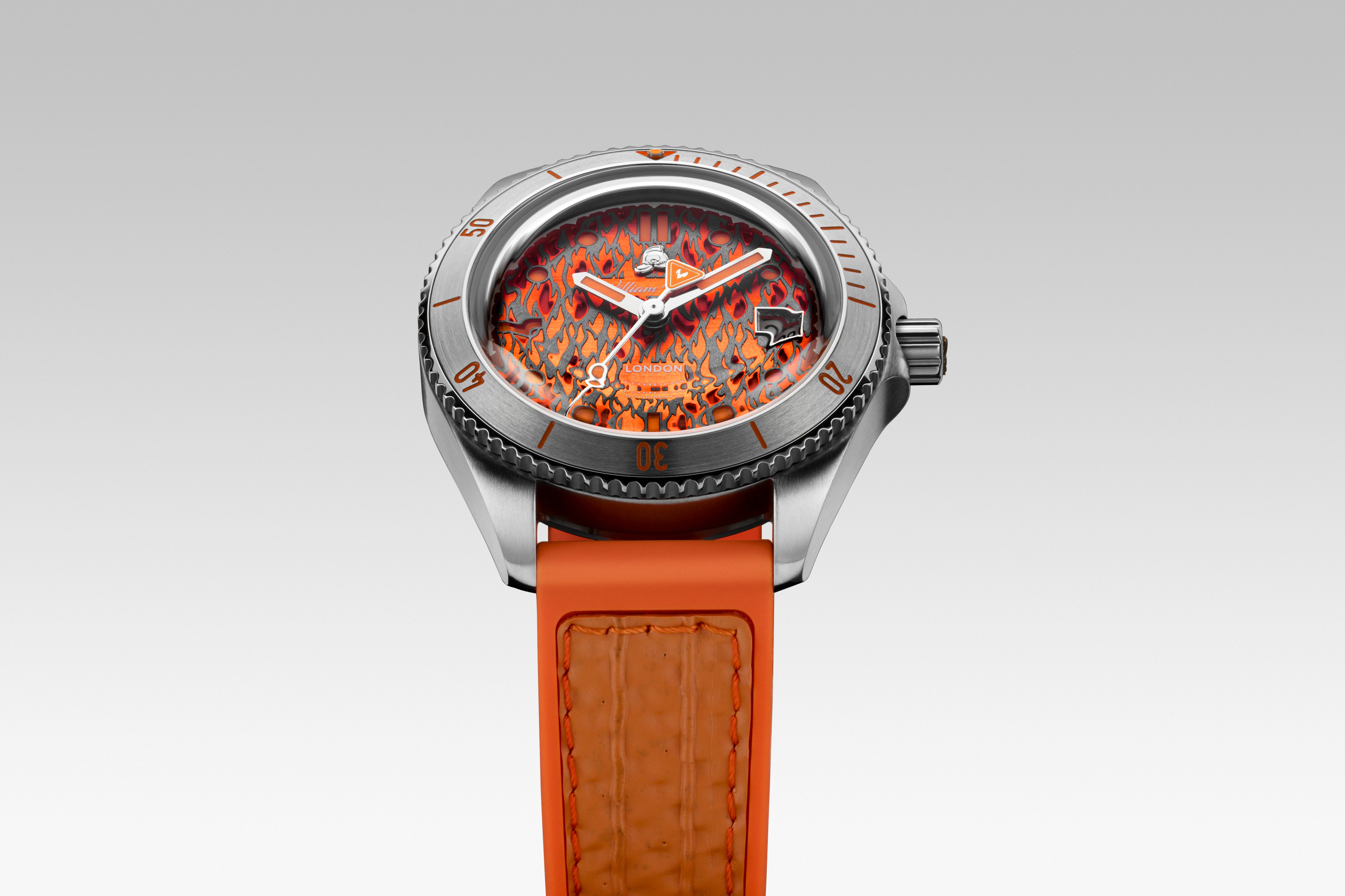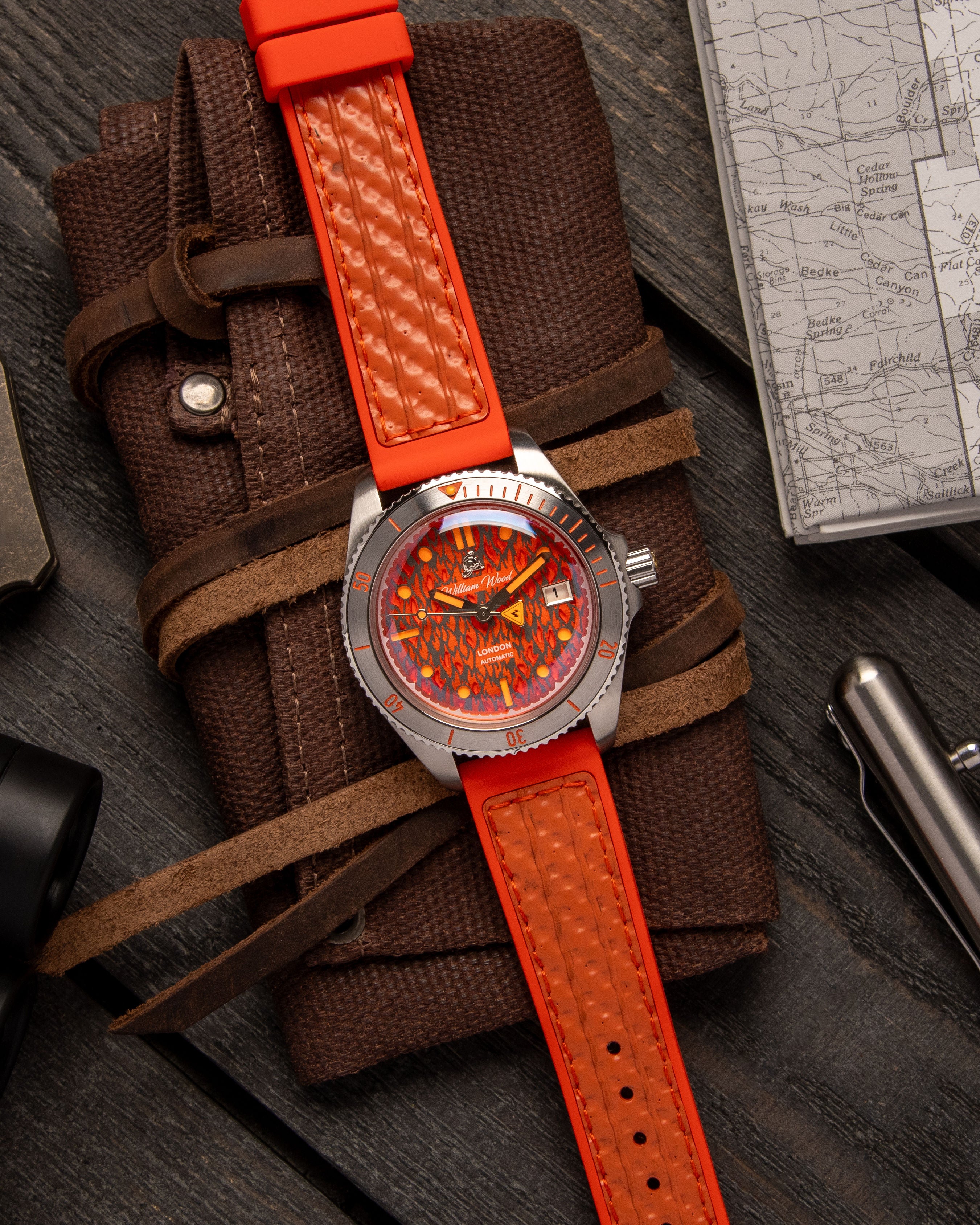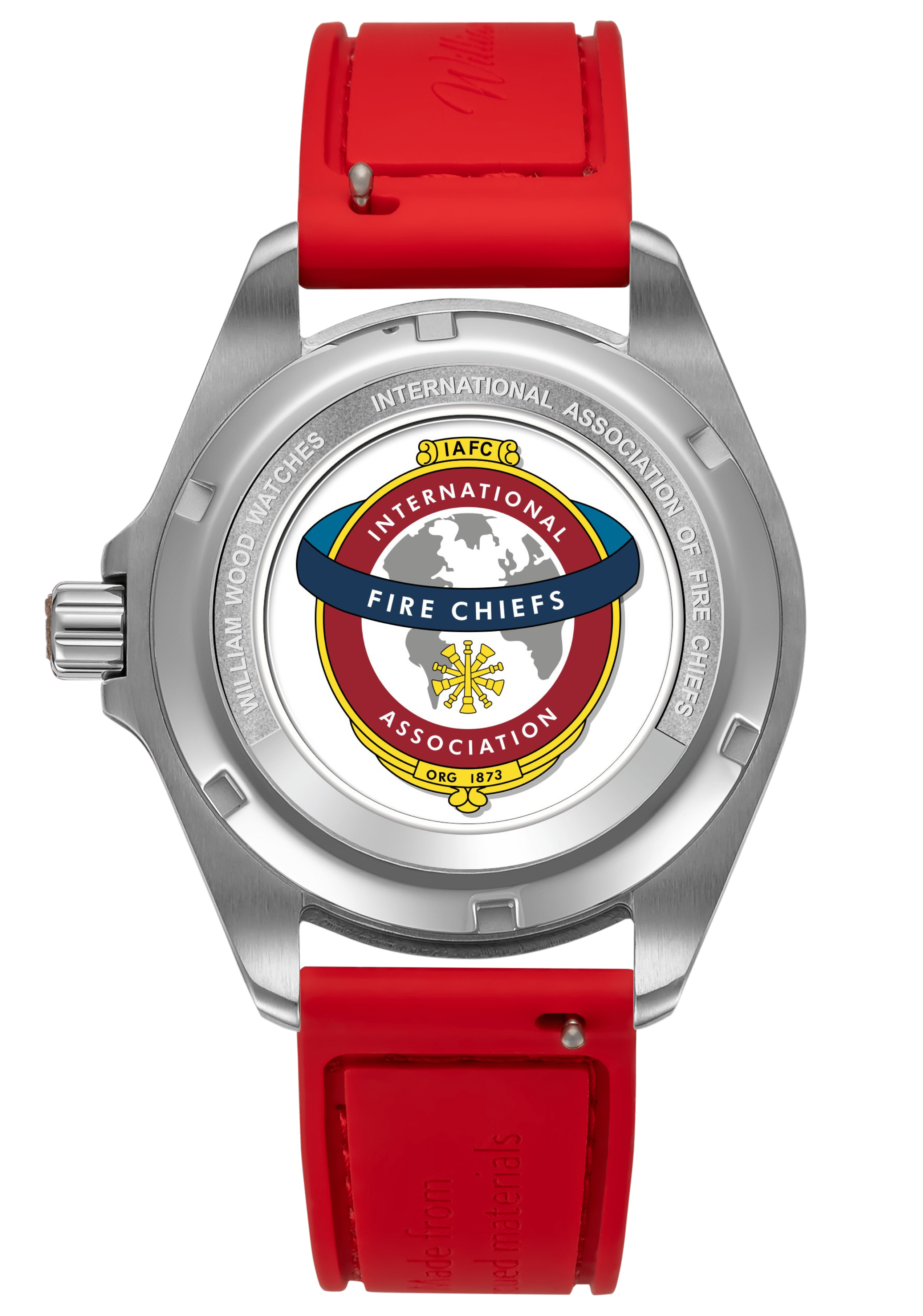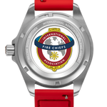 International Association of Fire Chiefs watch range comprising of our Valiant, Fire and Extinguisher Watch. Stainless steel automatic diving range featuring vintage fire bell seconds hand, fire engine pattern seconds track, crown made from a 100 year old melted-down British brass firefighter's helmet, IAFC crest caseback and straps made from upcycled fire hose. Beautifully presented in our genuine Italian leather, fire hose inspired travel roll, that holds up to 3 watches.