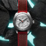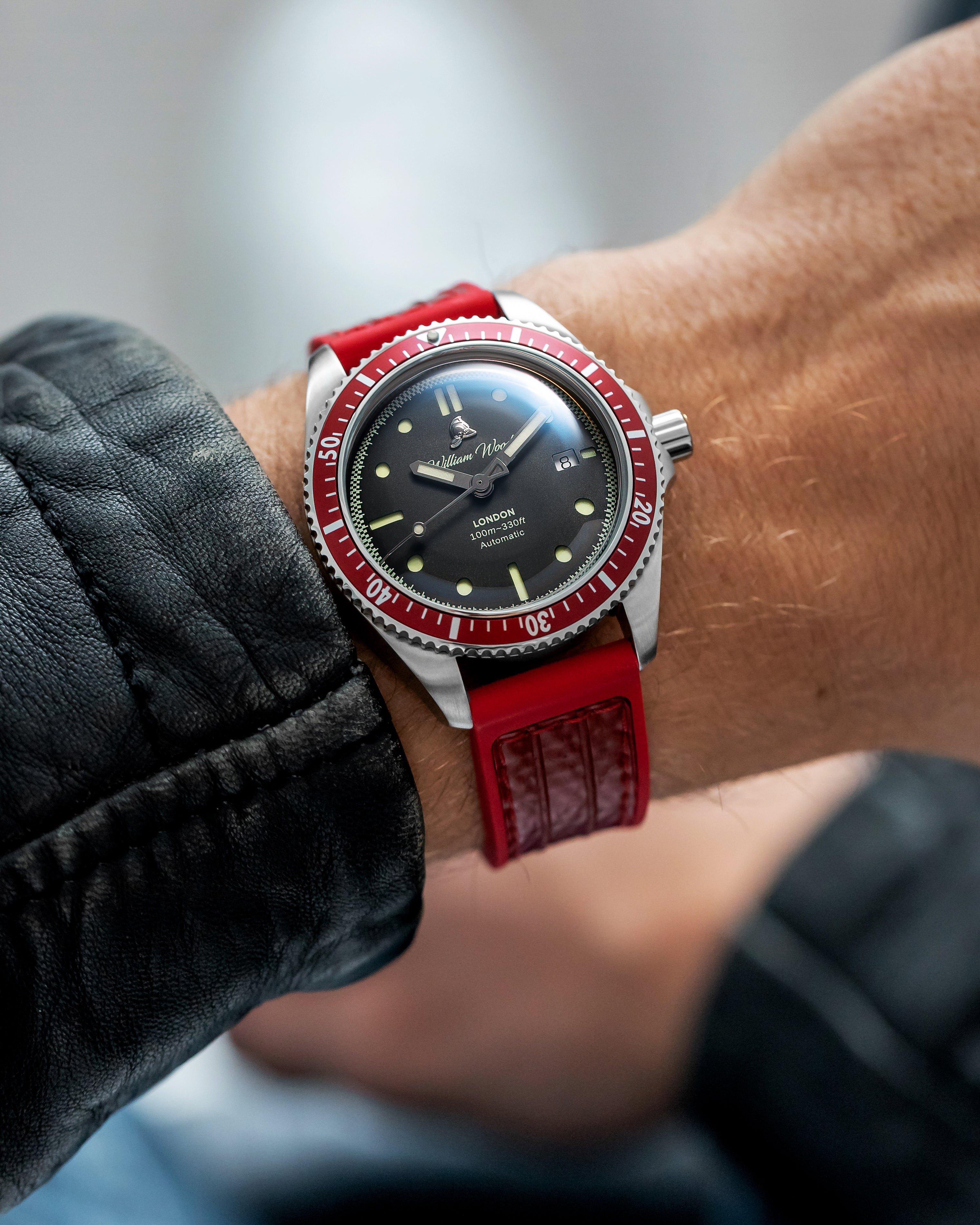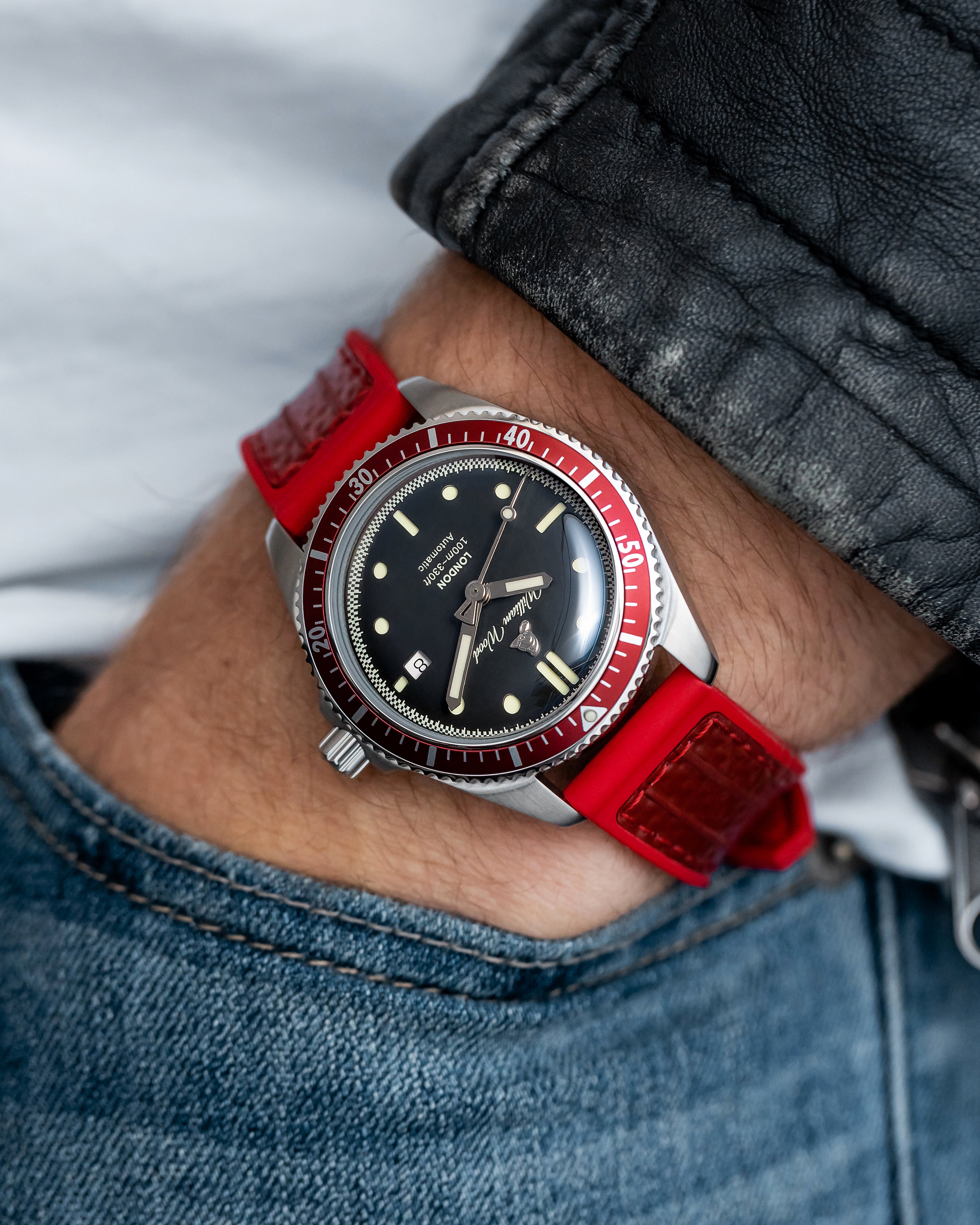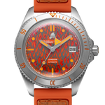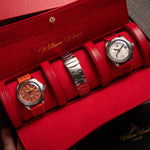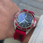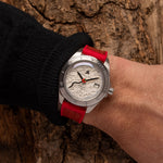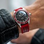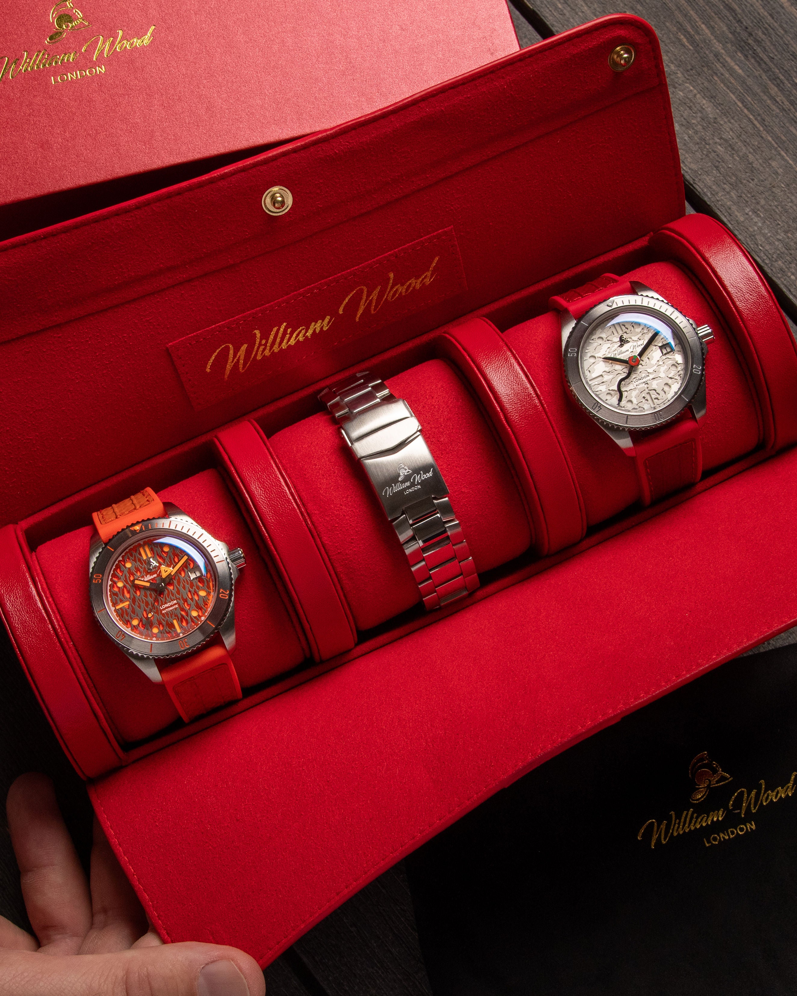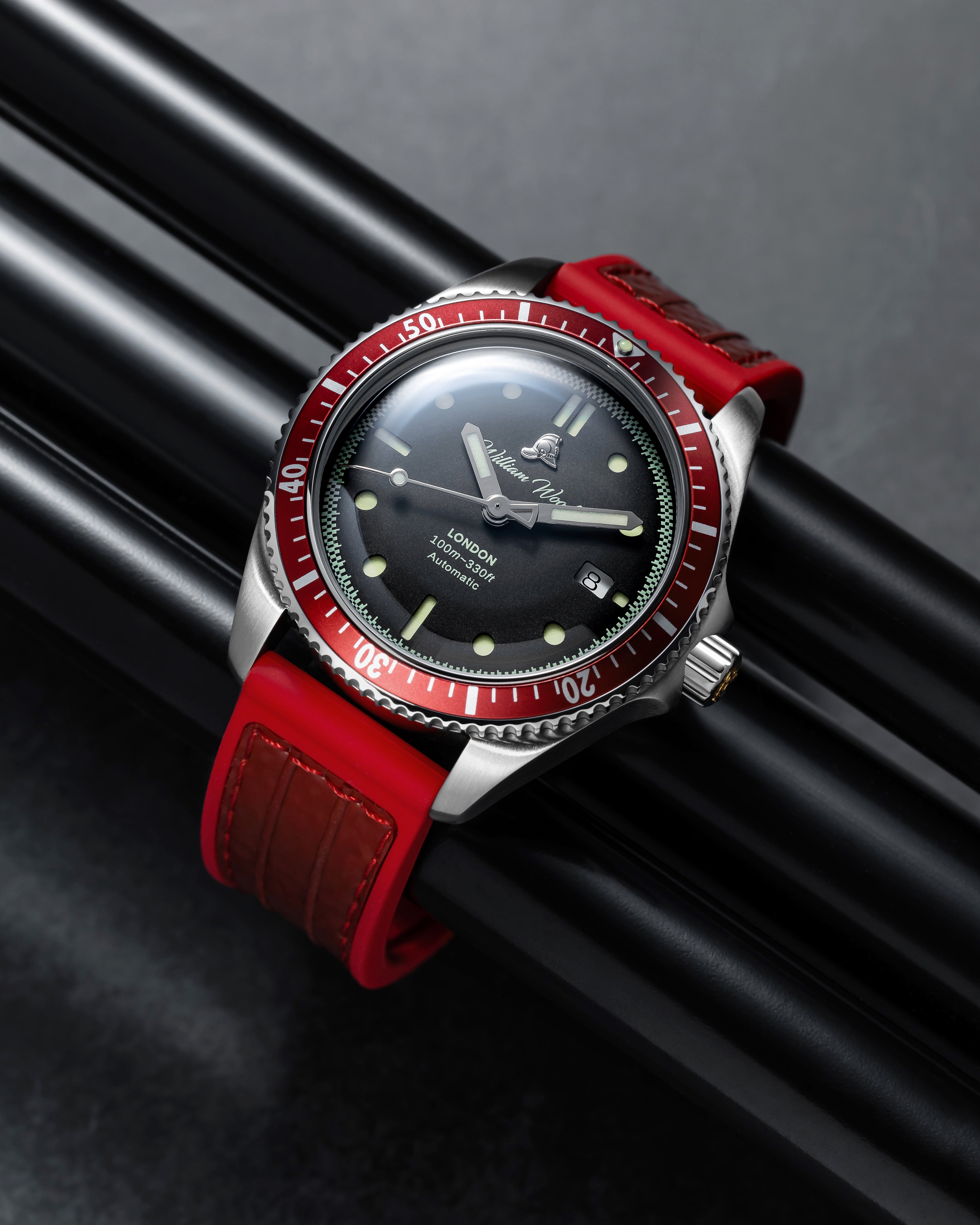 International Association of Fire Chiefs watch range comprising of our Valiant, Fire and Extinguisher Watch. Stainless steel automatic diving range featuring vintage fire bell seconds hand, fire engine pattern seconds track, crown made from a 100 year old melted-down British brass firefighter's helmet, IAFC crest caseback and straps made from upcycled fire hose. Beautifully presented in our genuine Italian leather, fire hose inspired travel roll, that holds up to 3 watches.