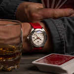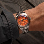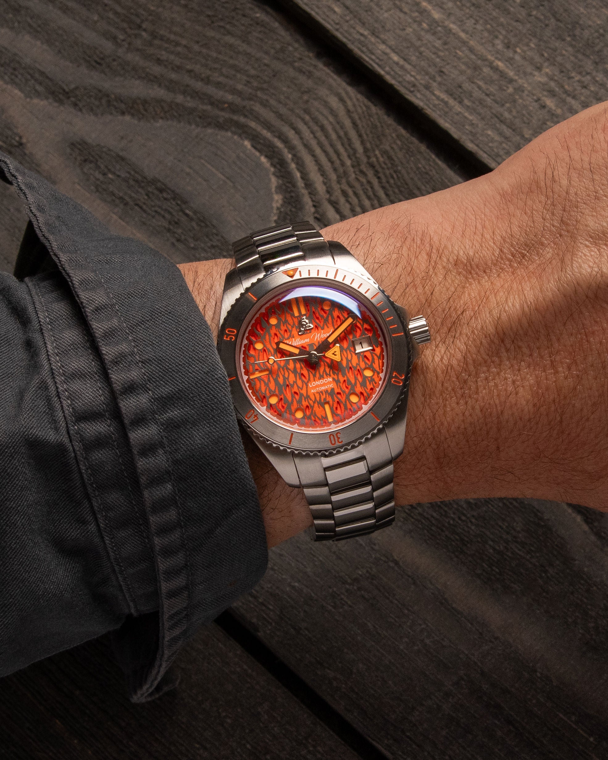 Matte curved sandwich dial with cut-out indices, green Super-LumiNova sub-layer, 3pm date window, polished hands and fire bell chime inspired seconds marker.
