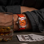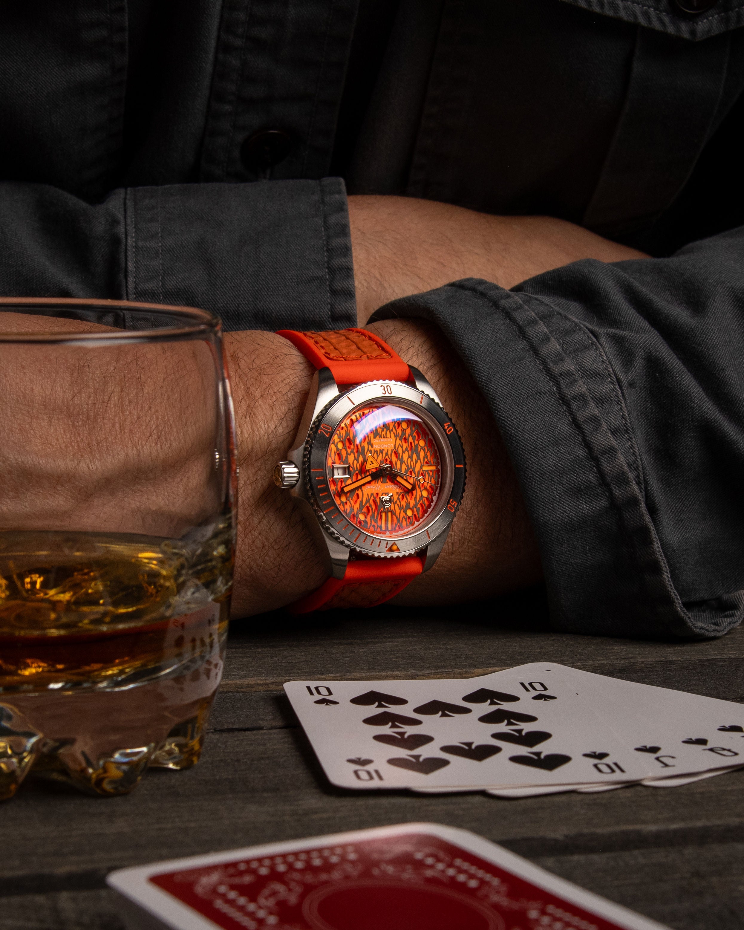 Inside our International Association of Fire Chiefs Watch lives a melted down 100 year old British brass firefighter's helmet, once worn by firefighters in the 1920's. The helmet is set inside our watch crown and is stamped with our iconic logo.