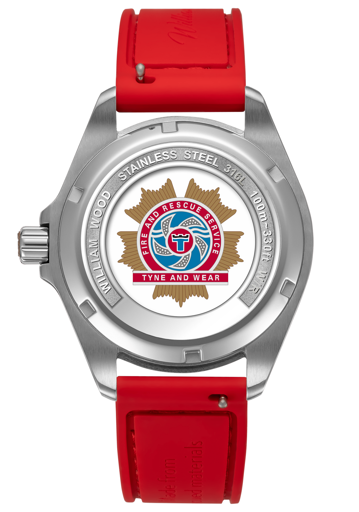 The caseback of the watch proudly features the Tyne and Wear Fire and Rescue Service logo printed beneath a sapphire glass.
