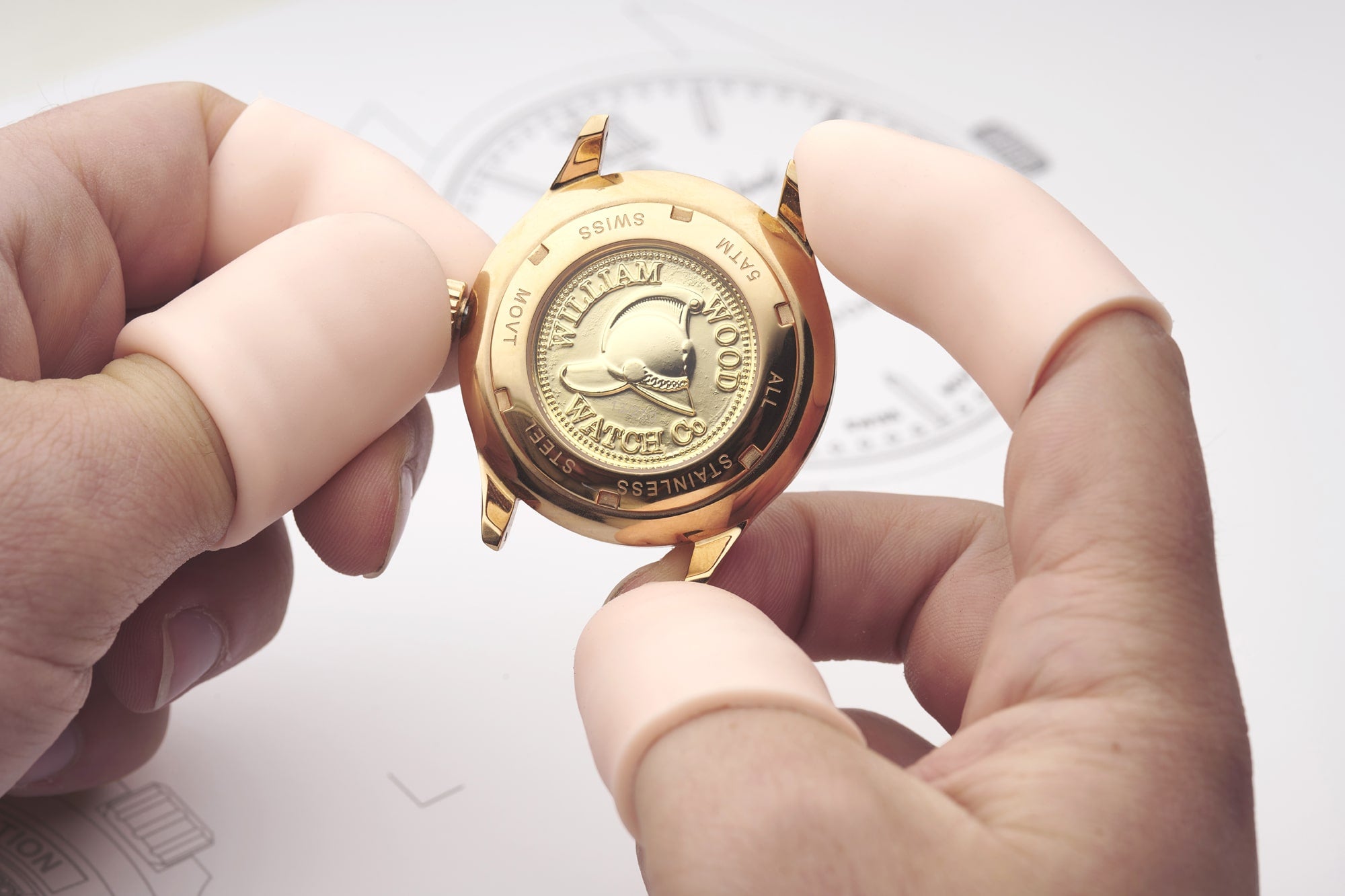 Whether it's melting down an original 1920's British brass firefighter's helmet and placing it in the back of our Chivalrous Collection or using blue upcycled fire hose from our Founder's grandfather's fire region of Tyne and Wear. Every single William Wood watch has real British firefighting history beating through every component.