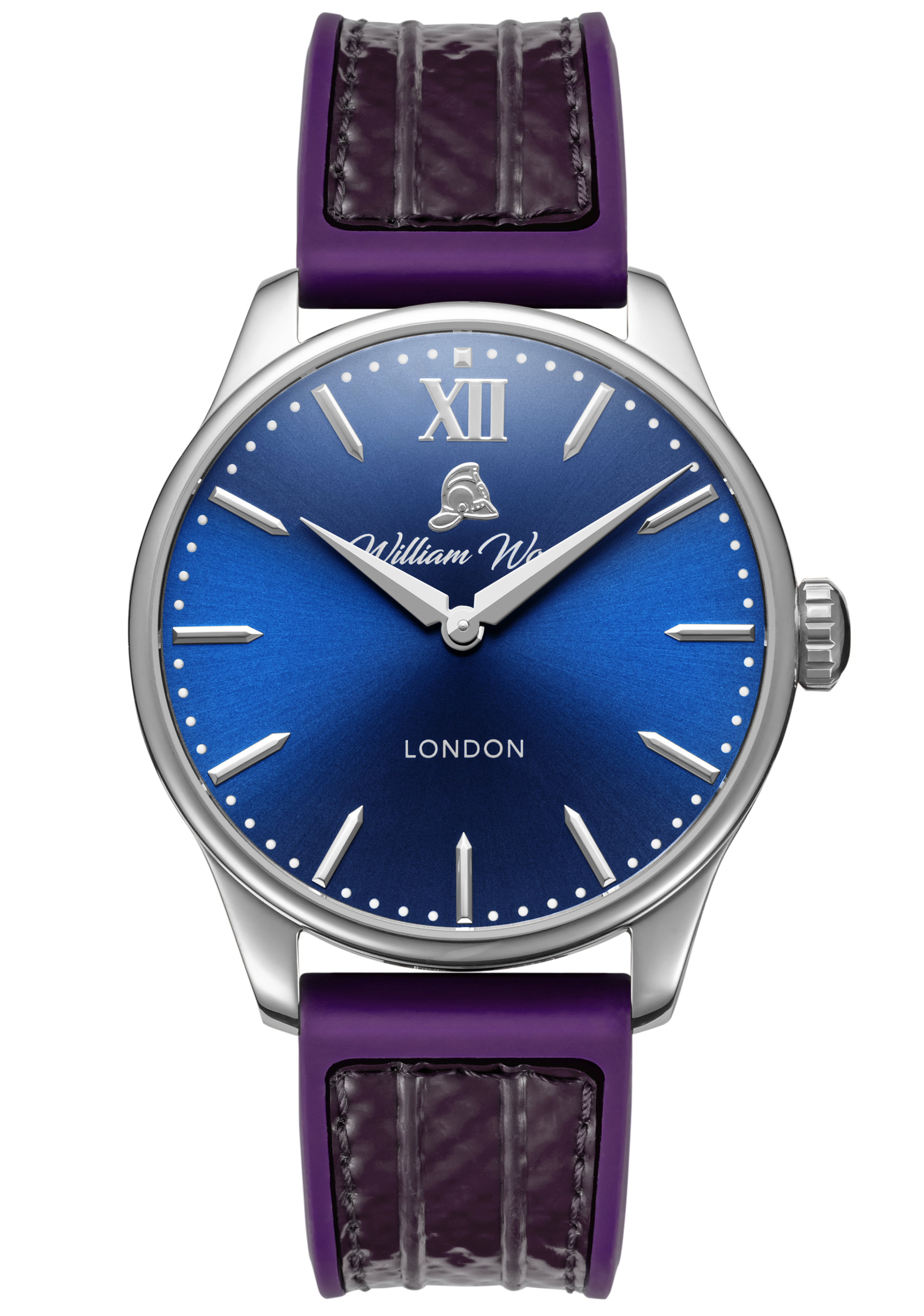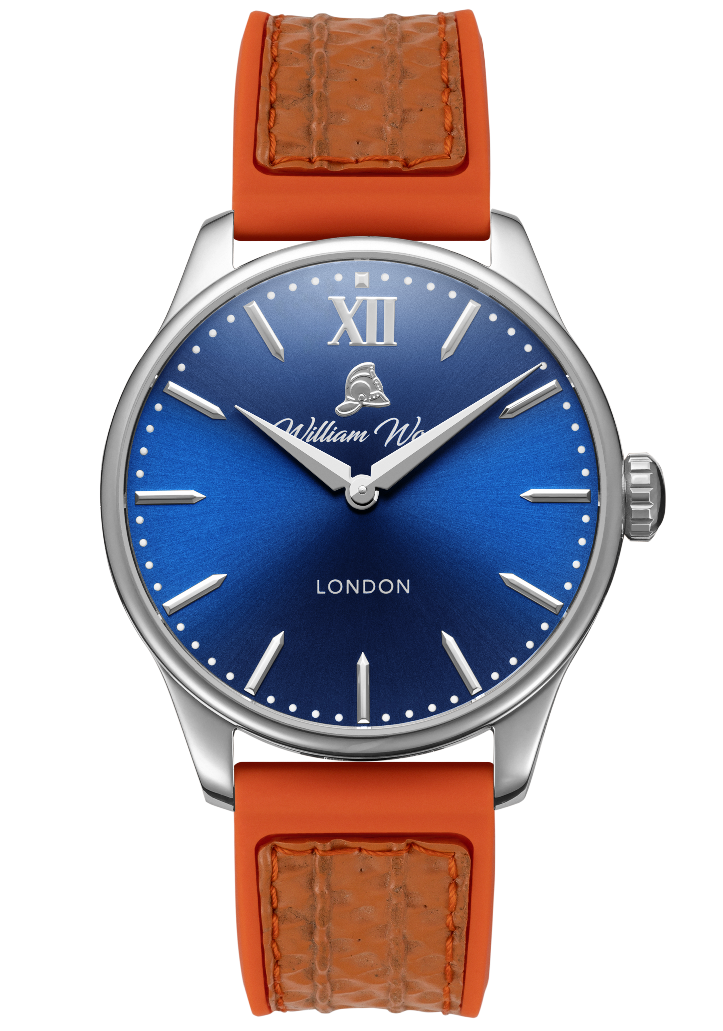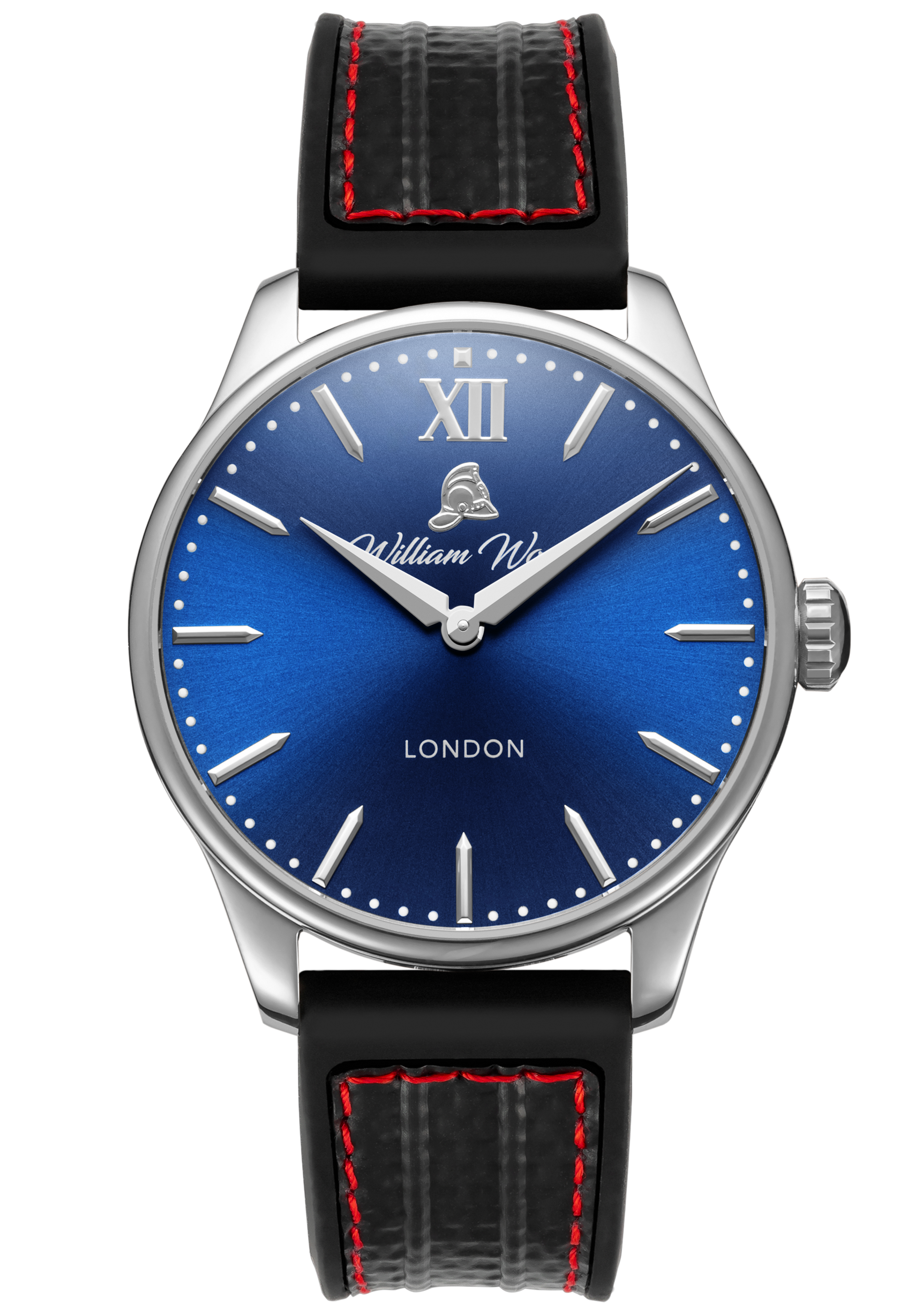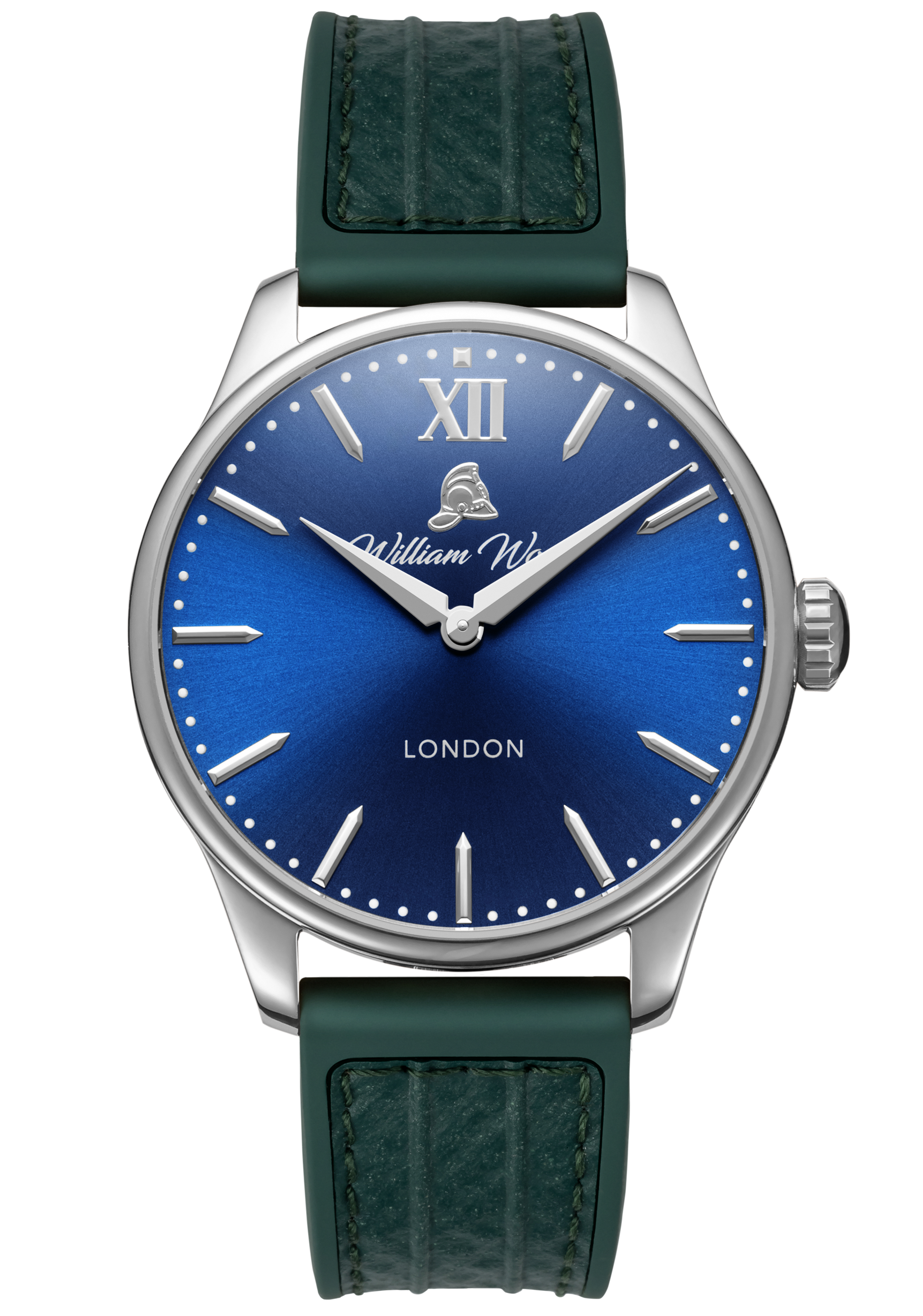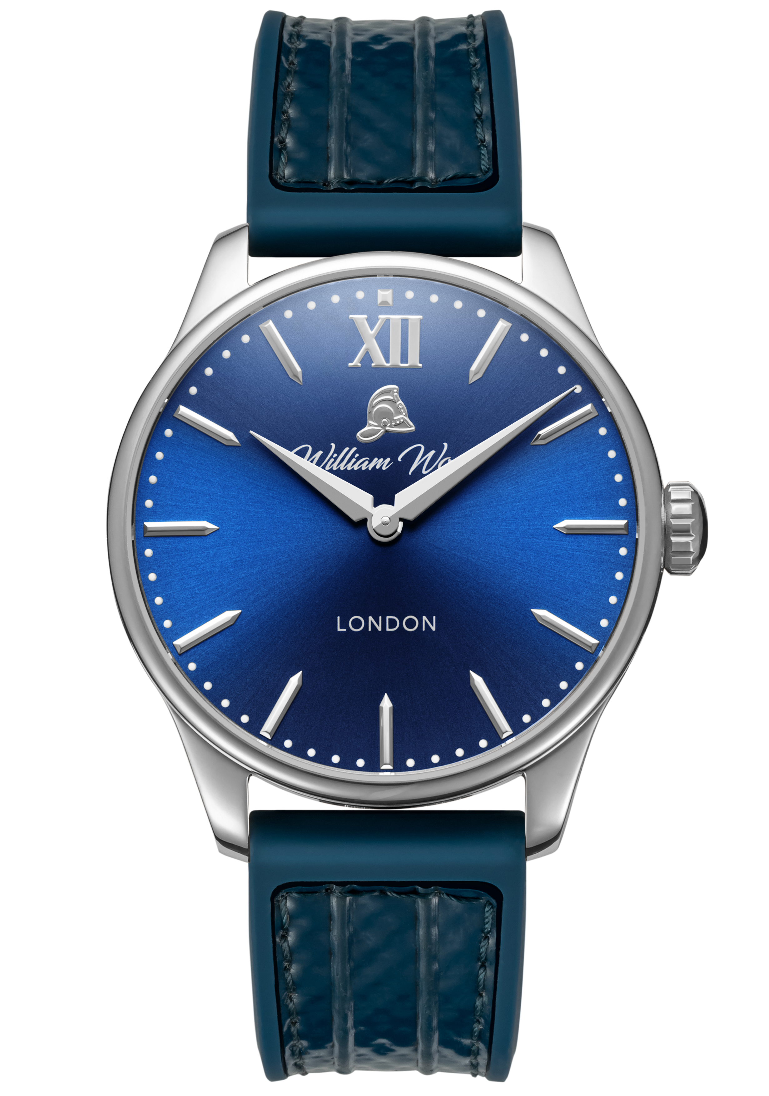 The material used in our glass is sapphire crystal with an applied anti-reflective coating. The glass is completely scratch resistant and finished with a low flush curve. The glass is tinted with a medium blue colour paying tribute to William Wood’s 25 years of service on a shift pattern called The Blue Watch for the Newcastle & Gateshead Fire Brigade.