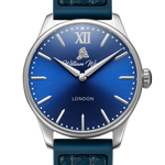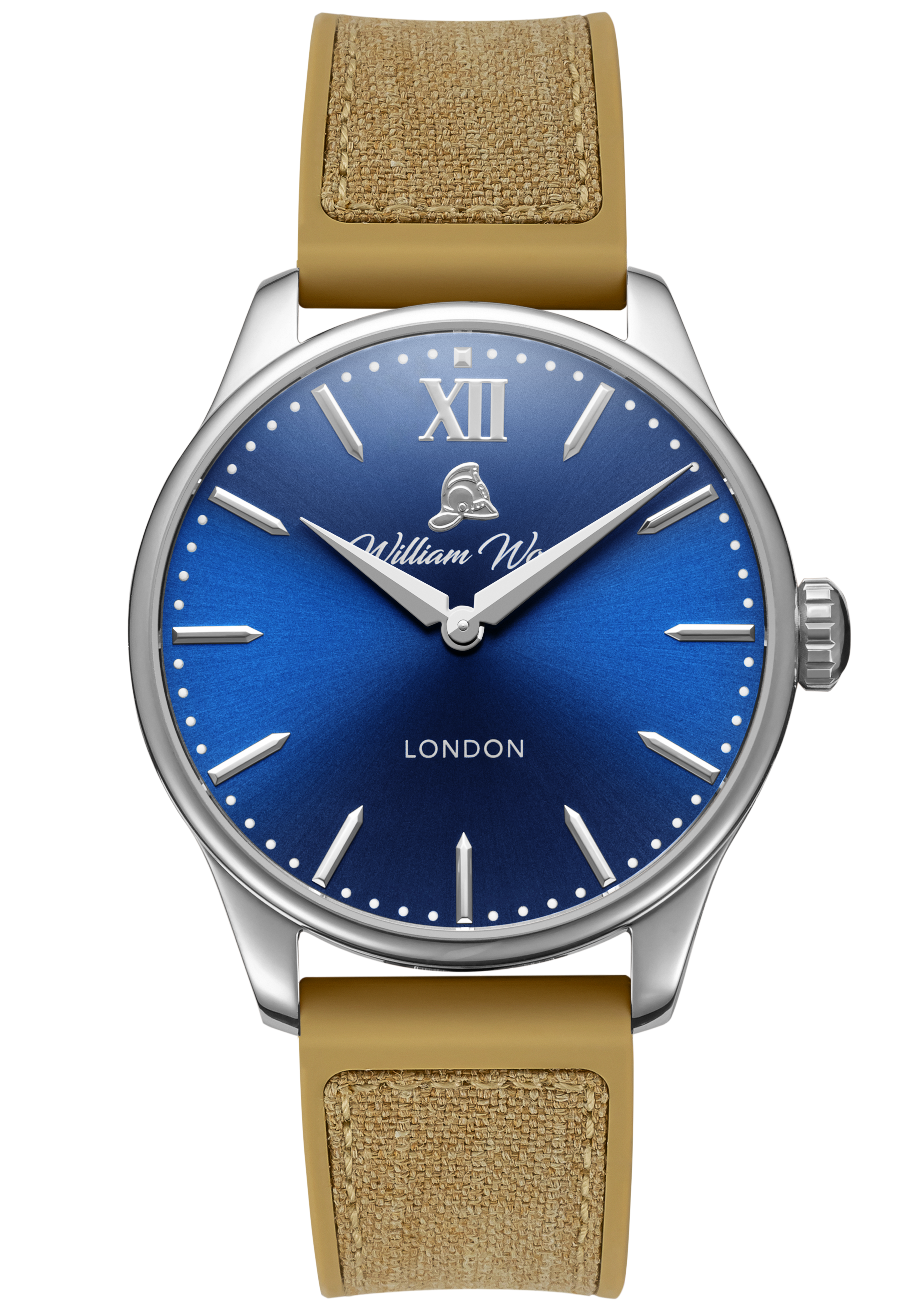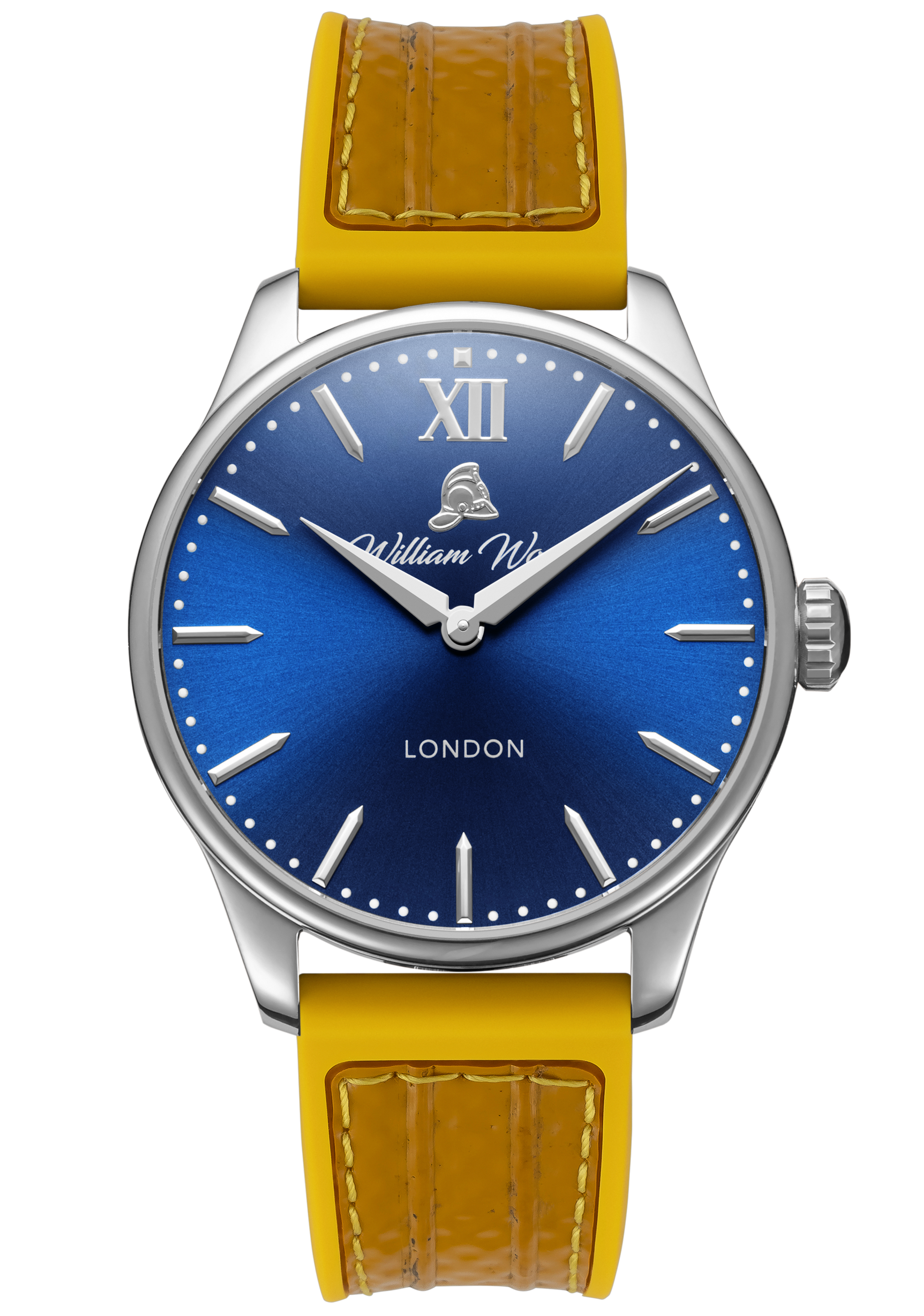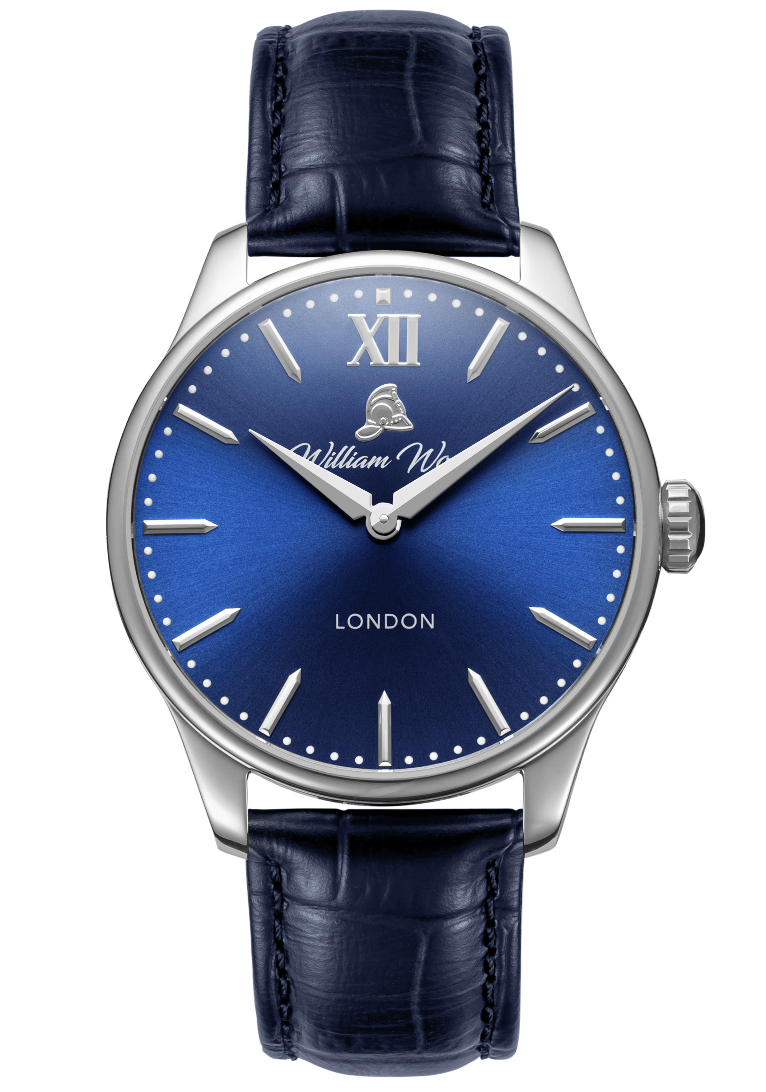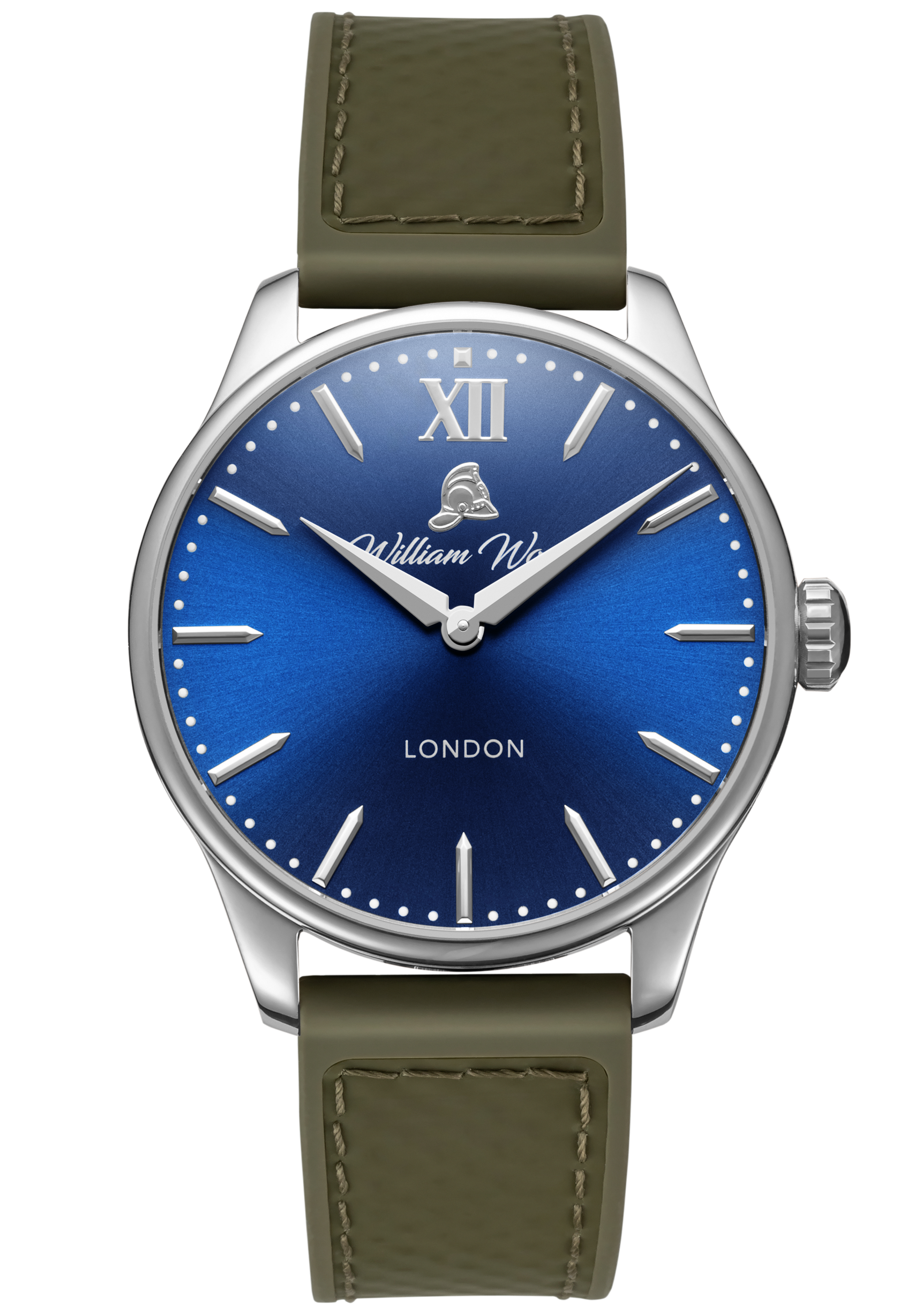 The material used in our glass is sapphire crystal with an applied anti-reflective coating. The glass is completely scratch resistant and finished with a low flush curve. The glass is tinted with a medium blue colour paying tribute to William Wood’s 25 years of service on a shift pattern called The Blue Watch for the Newcastle & Gateshead Fire Brigade.