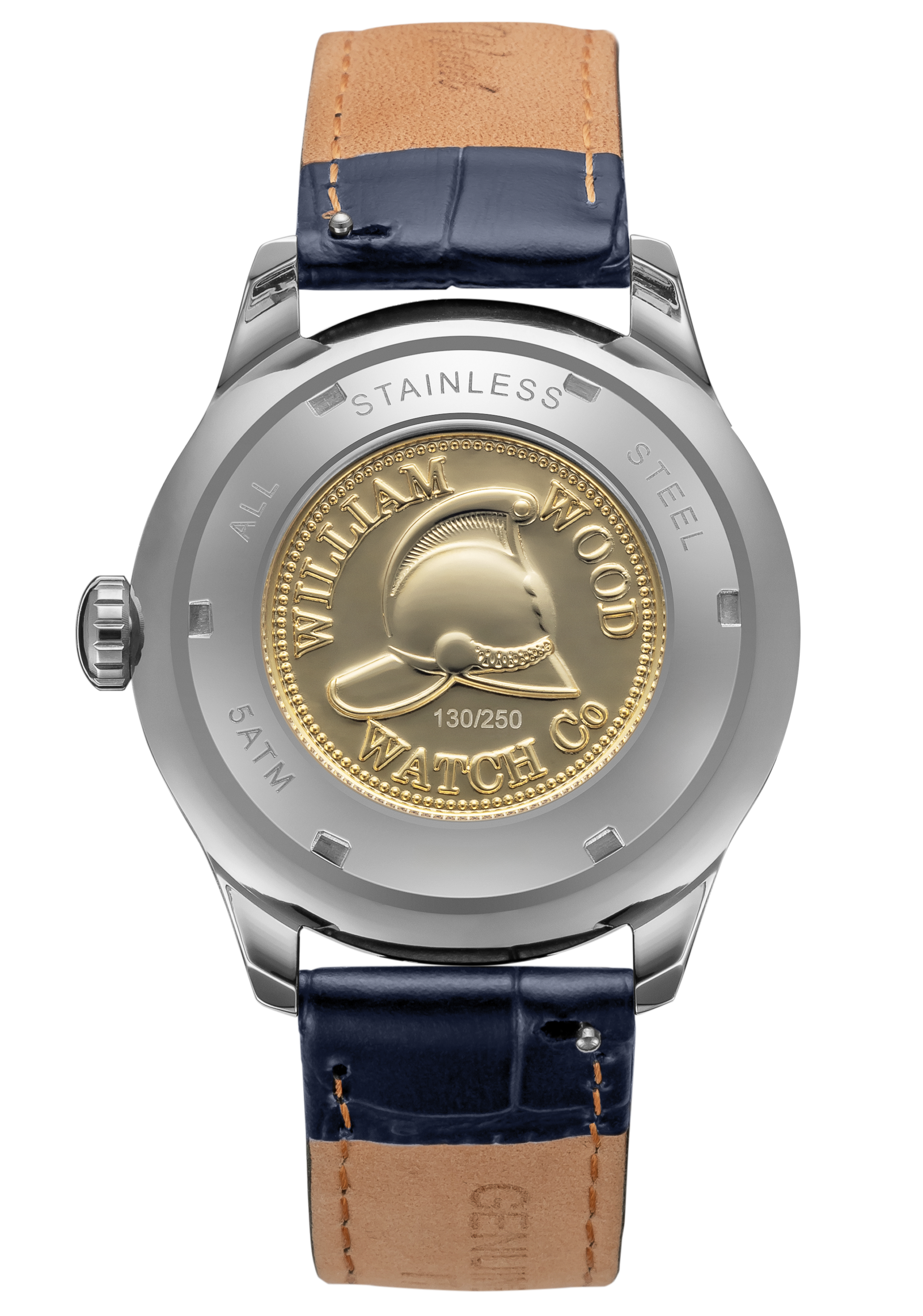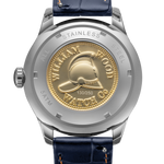 Our cases are available in either a brushed stainless or rose gold plated finish. The caseback features a limited edition commemorative coin caseback, made from a melted-down 100 year old British brass firefighter’s helmet worn by firefighters in the 1920’s. The coin is sealed with a sapphire crystal glass and the limited edition or authenticity markings are applied through laser engraving.